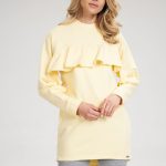 Sukienka midi z dekoltem w serek, zapinana na guziki, kimonowa góra. Rękaw 3/4 wykończony szerokim mankietem. W pasie szeroki karczek. Dół rozkloszowany. Sukienka bez podszewki.