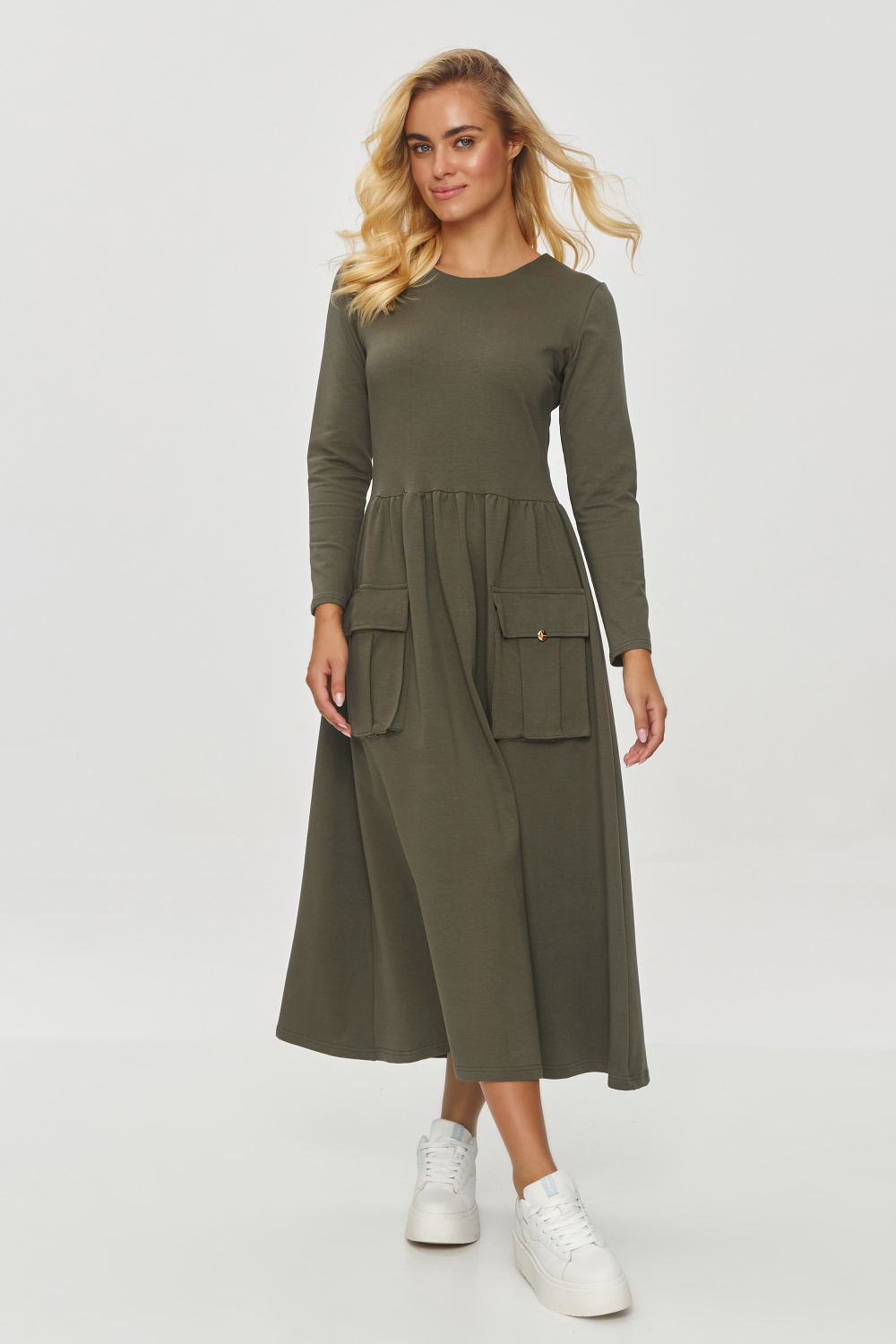 Rozkloszowana sukienka to doskonały wybór dla osób, które cenią sobie połączenie stylu i funkcjonalności. Model ma klasyczny, kobiecy krój o długości midi, z rozkloszowanym dołem. Wykonana z miękkiego, wygodnego materiału, który świetnie sprawdzi się w codziennym użytkowaniu. Sukienka posiada długie rękawy, co czyni ją idealną na chłodniejsze dni. Odcięcie w talii daje efekt subtelnego marszczenia, które podkreśla sylwetkę i dodaje sukience uroku. Charakterystycznym elementem są duże, naszywane kieszenie z przodu, dodatkowo zdobione eleganckim pozłacanym detalem, które nie tylko dodają stylu, ale również pełnią funkcję praktyczną. Ten model łączy w sobie wygodę i modny design, będąc idealnym wyborem na różne okazje.