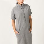 Sportowa sukienka z dzianiny dresowej z kapturem. Dół sukienki oraz rękawy wykończone ściągaczem. Środek kaptura uszyty w kontrastowym kolorze. W szwie kieszenie. Sukienka doskonała do pracy jak i na co dzień.