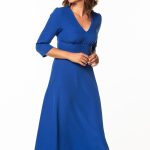 Dzianinowa sukienka midi za kolano z dekoltem w łódkę i długimi bufiastymi rękawami wykończonymi podwójnym mankietem.