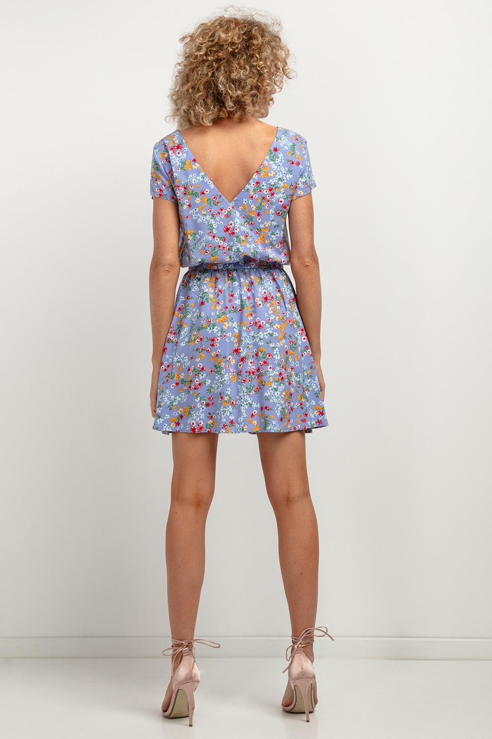 Piękna sukienka to świetna propozycja do zarówno eleganckich jak i codziennych stylizacji. Góra sukienki ma luźny fason, typu kimono i lekko rozkloszowany dół z długością przed kolano. Piękne, kwieciste wzory i głęboko wycięty dekolt w kształcie V z tyłu przyciągają uwagę, a wiązany pasek ze złotą sprzączką podkreśla talię.