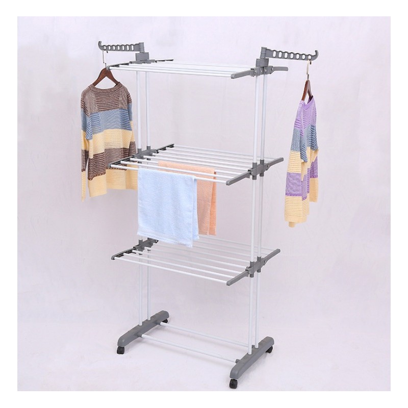 Rozkładana suszarka na pranie z sześcioma półeczkami i dwoma ramionami. SPECYFIKACJA: