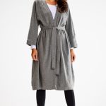 Długi kardigan z szerokim rękawem oraz paskiem do wiązania. Wykonany z miękkiego materiału, idealny do wielu stylizacji.