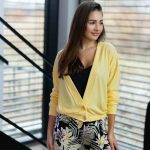 liczny, gładki kardigan zapinany na dwa guziki u dołu. Krótki, do okolic bioder. Sprawdzi się zarówno jako sweterek jak i jako narzutka, która uzupełni piżamę z linii Ana i Adelina marki Sensis. Komfortowy, długi rękaw. Uroczy, słoneczny kolor.