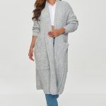 Długi kardigan damski o kroju oversize to idealna propozycja dla kobiet ceniących wygodę. Sweter sięga poniżej kolan, co nadaje mu nieco eleganckiego charakteru. Kardigan ma szerokie, długie rękawy zakończone ściągaczami, które pozwalają na regulację ich długości. Materiał przyjemny, z wyraźnym prążkowanym splotem, co podkreśla jego miękkość i ciepło. Sweter nie posiada zapięcia, co uwydatnia jego swobodę, a także szerokie kieszenie po bokach, które są praktyczne i stylowe. Taki kardigan idealnie nadaje się na chłodniejsze dni i stanowi doskonałą bazę na komfortowy i stylowy look, zarówno do pracy jak i na wyjście z przyjaciółmi.