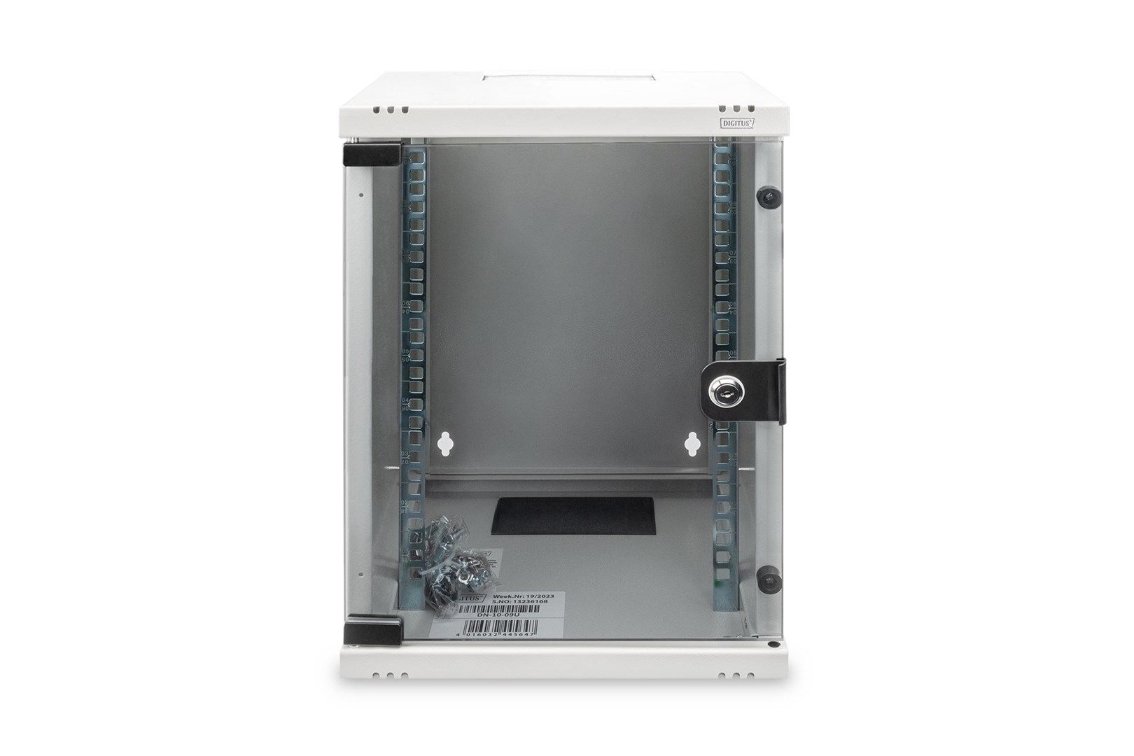 Szafa sieciowa wisząca 10″ 9U rack 312×300, drzwi szyba, szary, niedzielona, złożona, 30kg