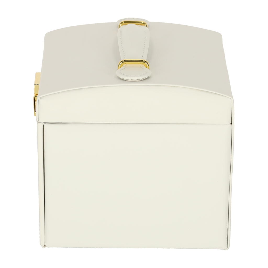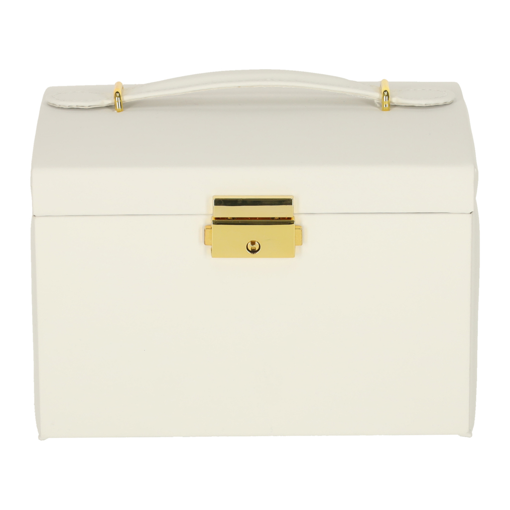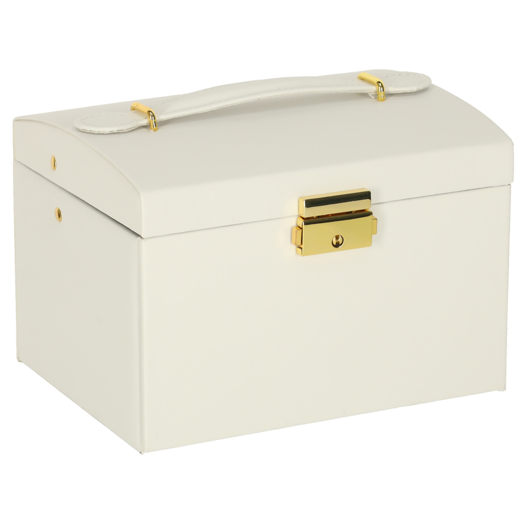 Zamykany na kluczyk biały kuferek z szufladami i przegródkami do przechowywania biżuterii. Ozdobi minimalistyczne wnętrze i ucieszy każdego miłośnika dodatków. Wymiary: 13 cm x 14 cm x 17 cm, kolor: biały
