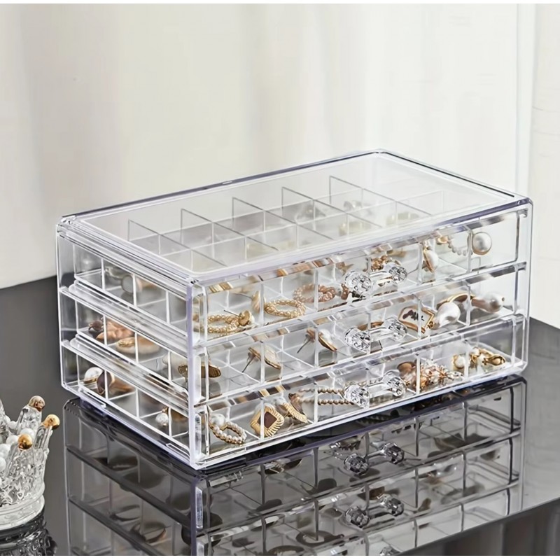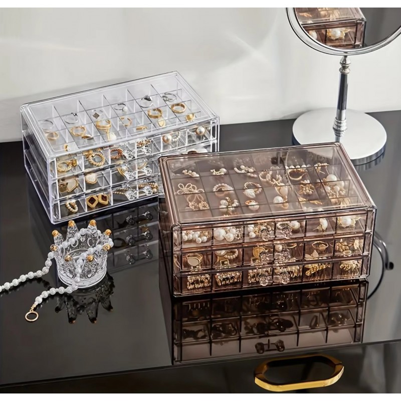 Szkatułka na biżuterię, organizer transparentny – 3 szuflady, 72 przegródki Cechy produktu: