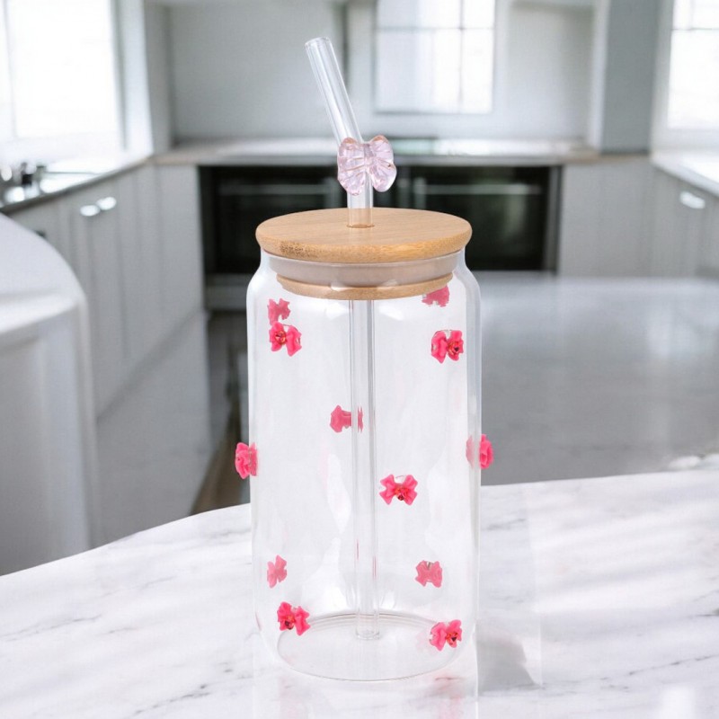 Szklanka, różowe kokardki z cyrkoniami – z rurką i bambusową pokrywką 460 ml – SZK135