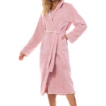 Damski szlafrok o długości za kolano, wykonany z miękkiego materiału, z eleganckimi wykończeniami typu piping. Na wysokości piersi znajduje się subtelny haft, a praktyczne kieszenie zwiększają funkcjonalność. Długi rękaw oraz wiązanie na pasek zapewniają komfort i idealne dopasowanie. Szlafrok pakowany w praktyczny woreczek foliowy.