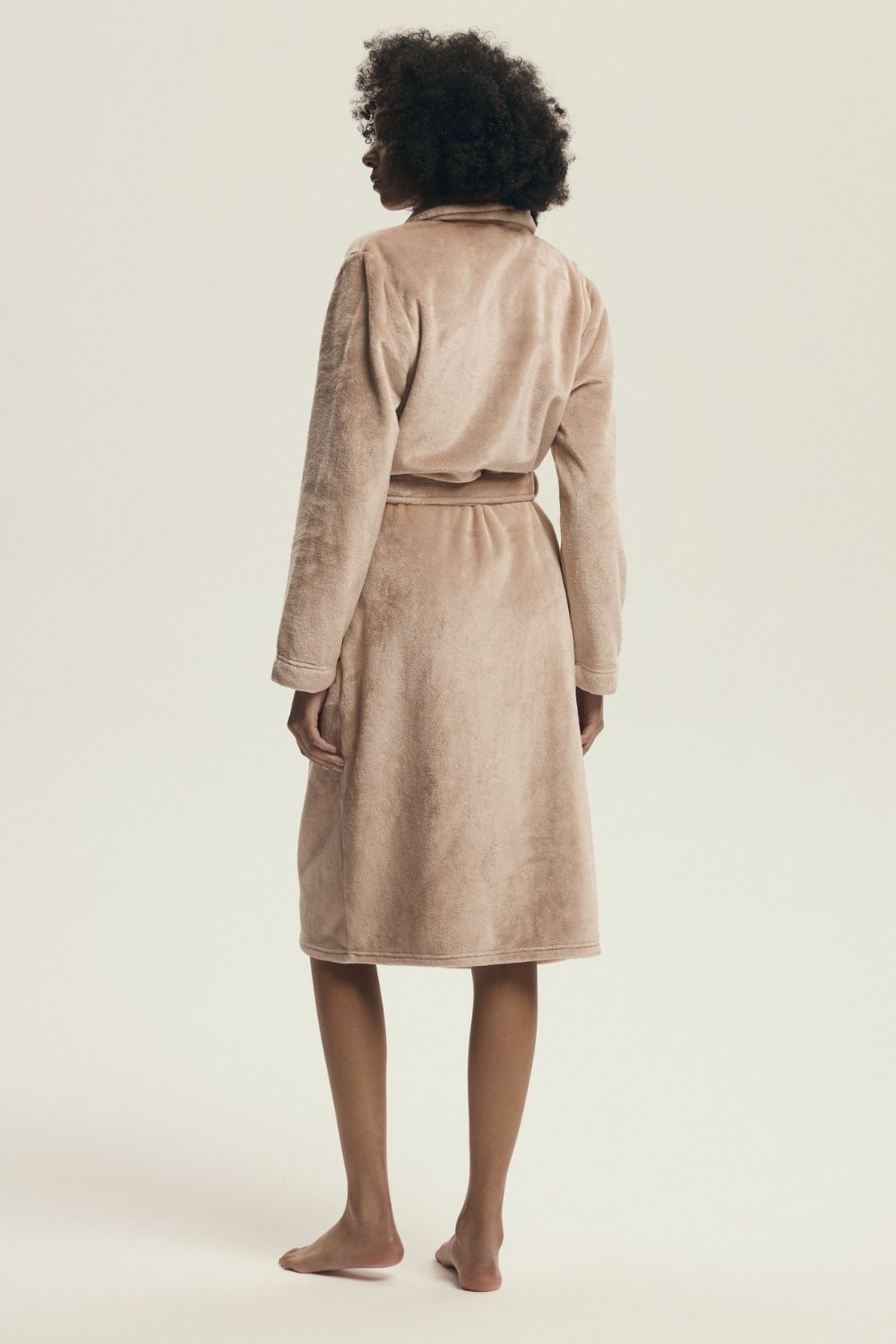 Elegancki szlafrok damski wykonany z połyskującej dzianiny, która nadaje całości subtelnego i kobiecego charakteru. Model o komfortowym kroju z praktycznymi kieszeniami oraz półkolistym dołem, który pięknie układa się na sylwetce. Szlafrok posiada wiązanie w pasie, pozwalające dopasować go do figury, oraz jest pakowany w woreczek foliowy idealny również jako stylowy prezent.