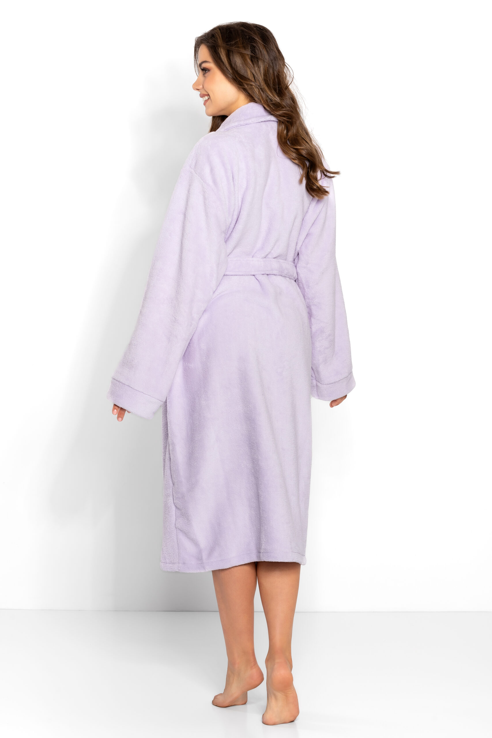 Paloma to stylowy szlafrok damski w subtelnym, fioletowym odcieniu. Podomka zdobiona jest eleganckimi lamówkami. Model posiada długi rękaw, kieszenie przy biodrach oraz wiązanie w talii. Krój ze stylowym kołnierzem (bez kaptura). Idealny szlafrok na prezent. Produkt polski. Wysoka jakość.