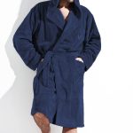 Welurowy szlafrok męski. Długi, z szalowym kołnierzem, wiązany w pasie. Na wysokości bioder dwie kieszenie. Mankiety, kołnierz i kieszenie wykończone wzorzystą dzianiną. Na wysokości klatki piersiowej mała aplikacja.