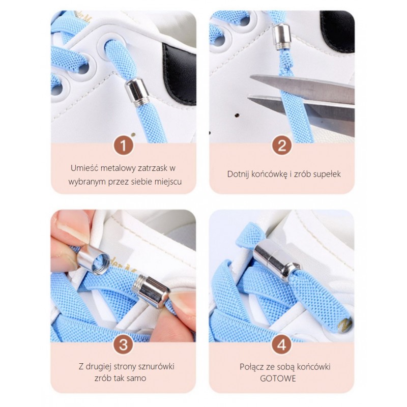 Para elastycznych sznurowadeł z metalową spinką do zakręcania. Idealne dla dzieci i osób uprawiających sport. Sznurówki można dopasować na wymiar buta. Zestaw zawiera: