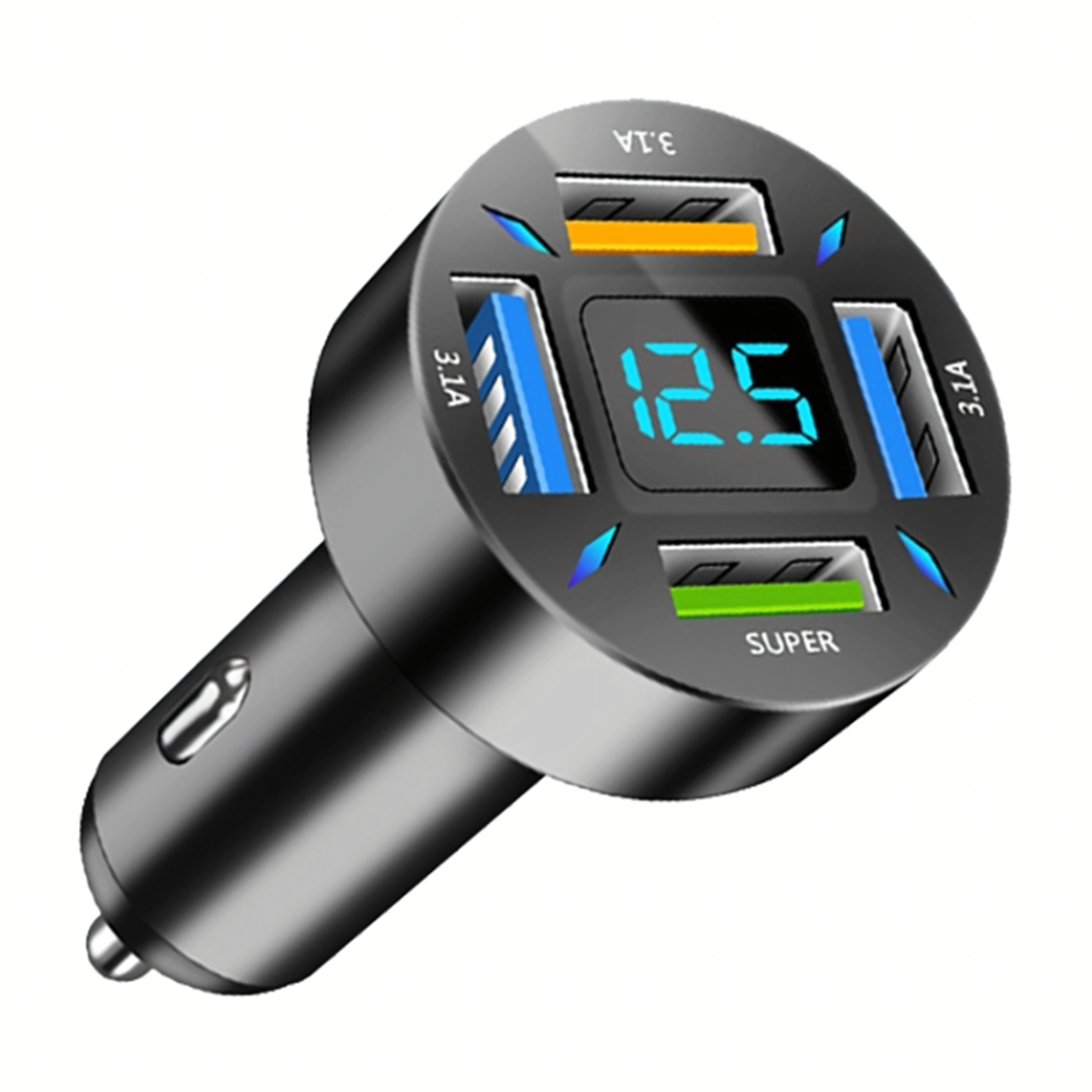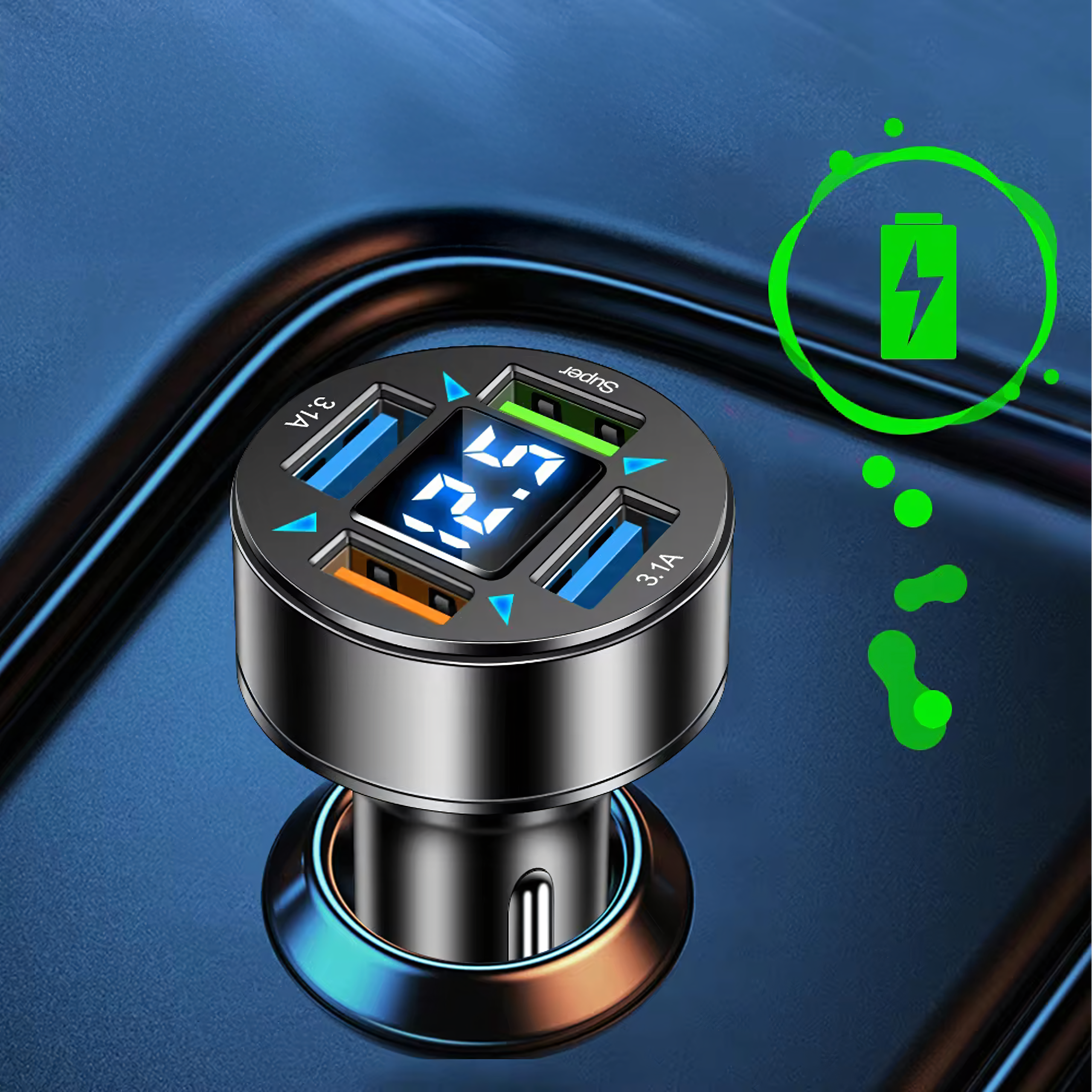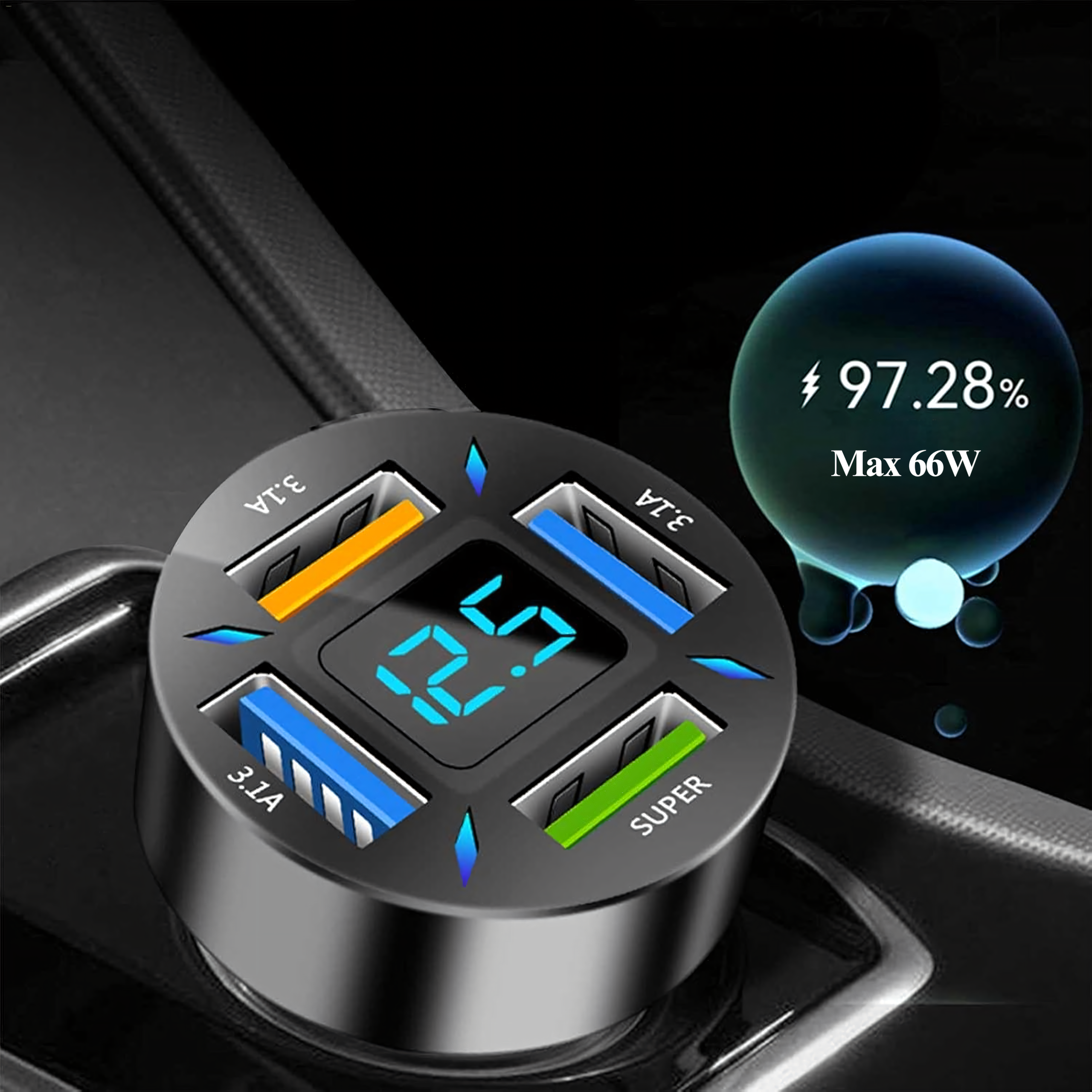 Ładowarka samochodowa 66W 4×USB z wyświetlaczem LED – szybkie ładowanie Quick Charge, monitoring napięcia akumulatora w czasie rzeczywistym i możliwość podłączenia aż 4 urządzeń jednocześnie. Elegancka, wytrzymała i kompatybilna z większością samochodów 12–24V.