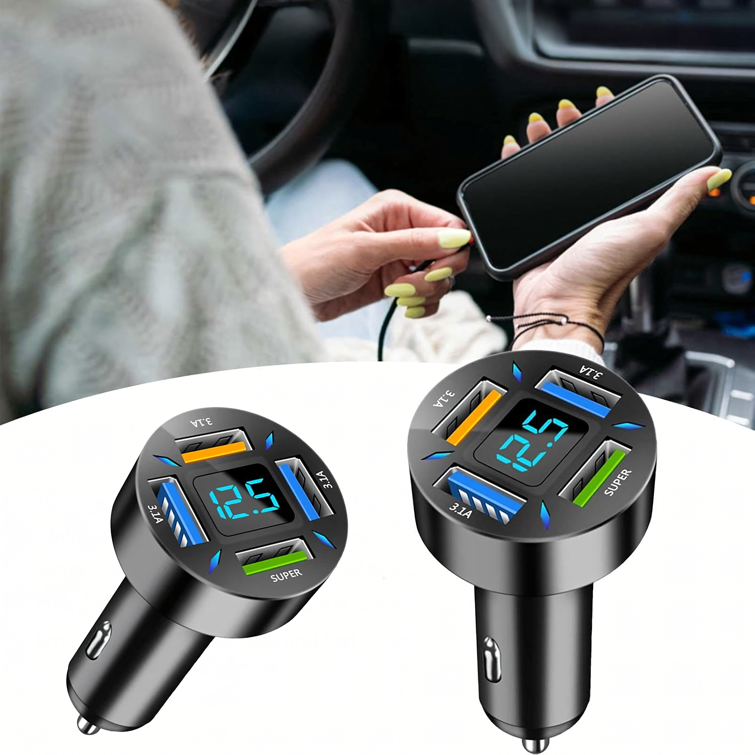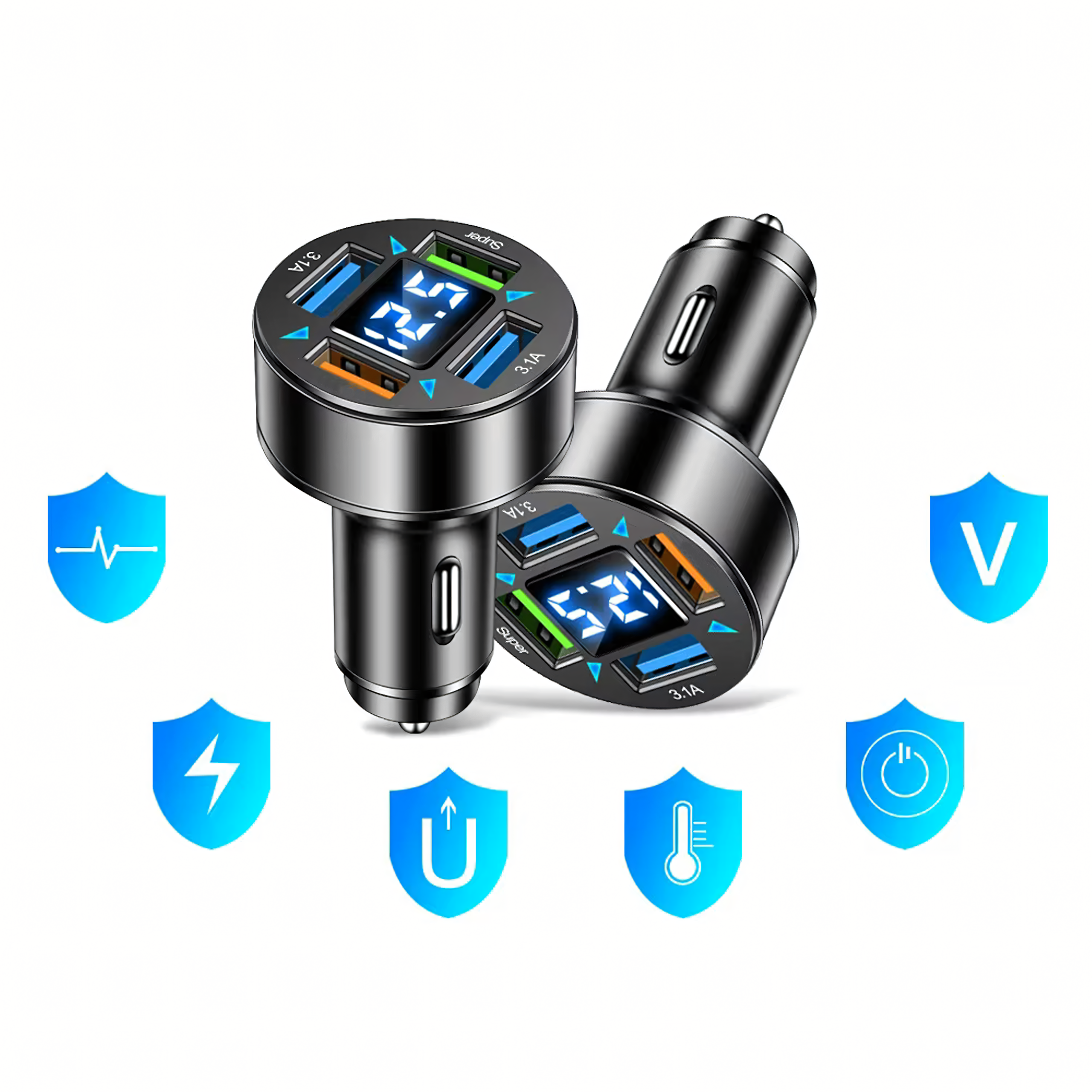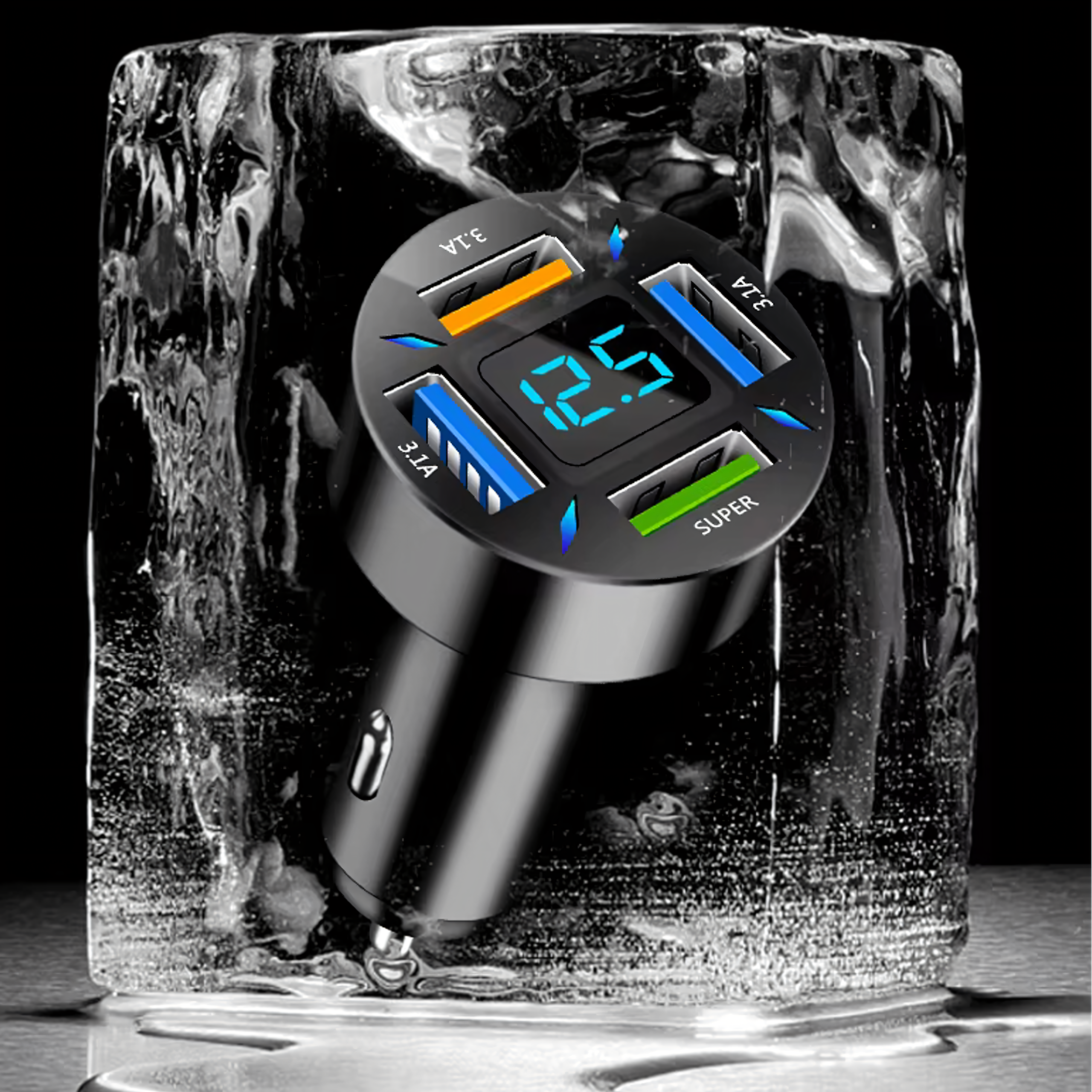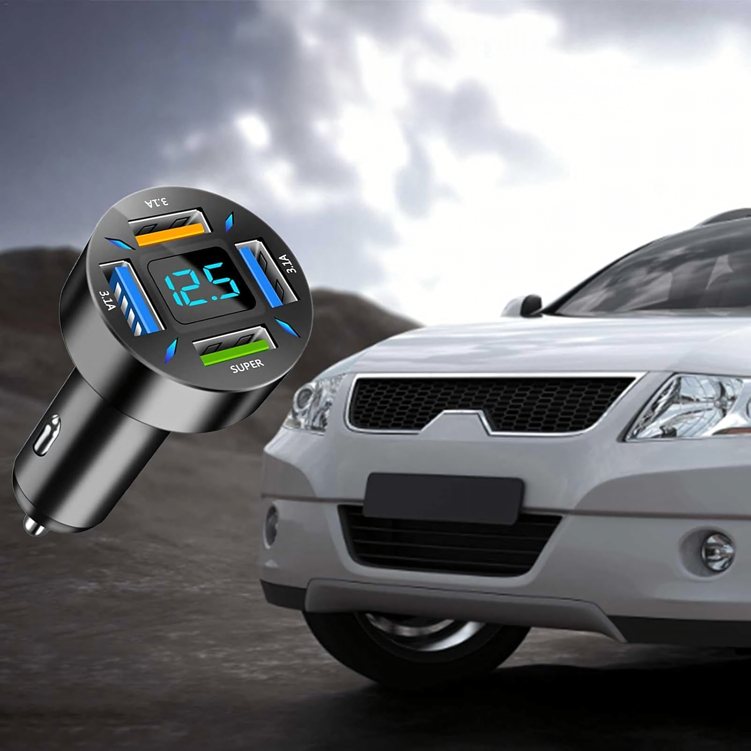 Ładowarka samochodowa 66W 4×USB z wyświetlaczem LED – szybkie ładowanie Quick Charge, monitoring napięcia akumulatora w czasie rzeczywistym i możliwość podłączenia aż 4 urządzeń jednocześnie. Elegancka, wytrzymała i kompatybilna z większością samochodów 12–24V.