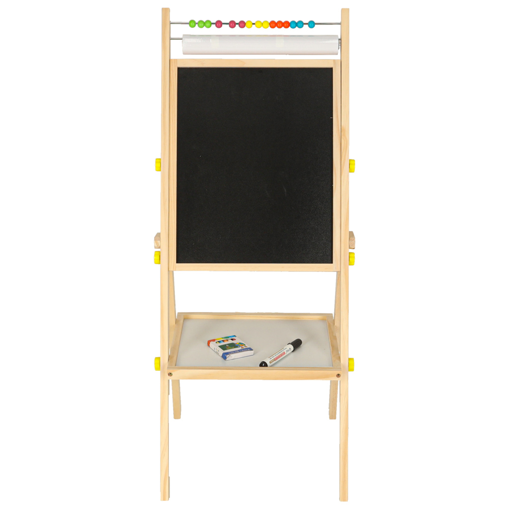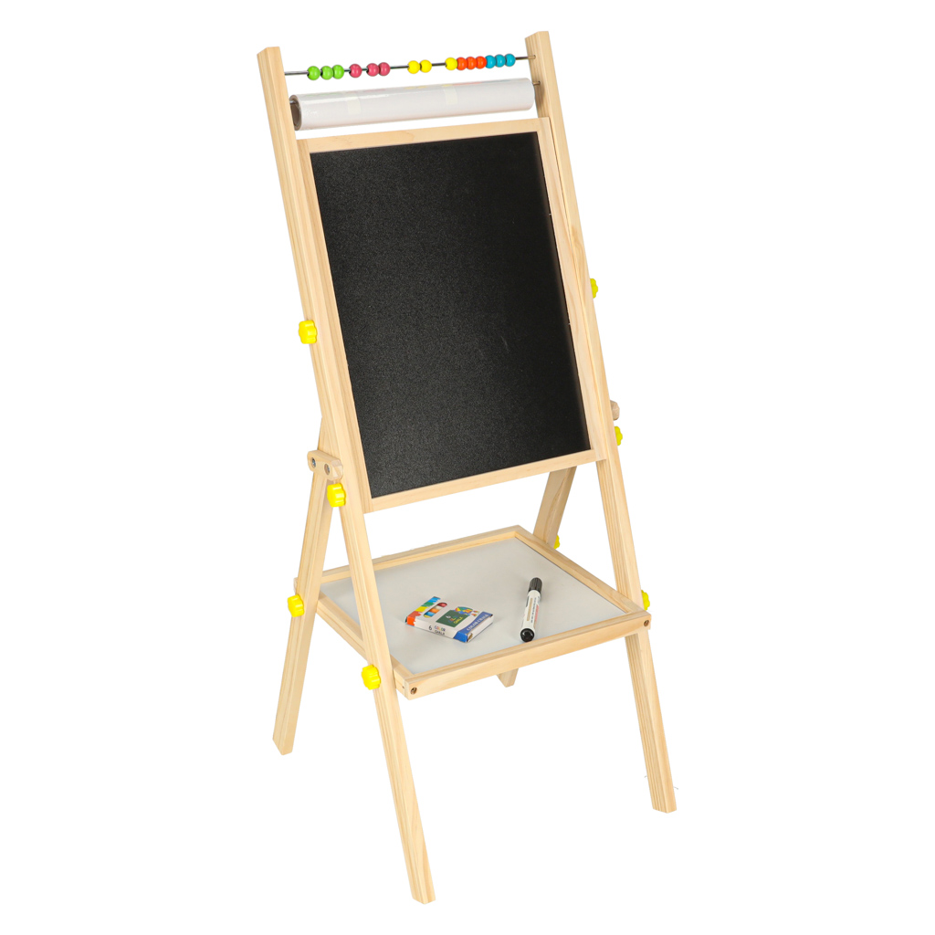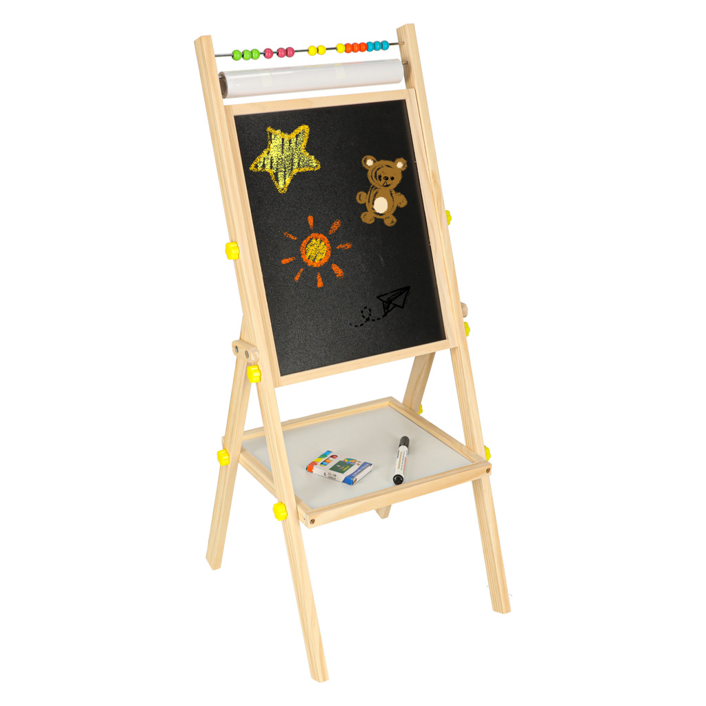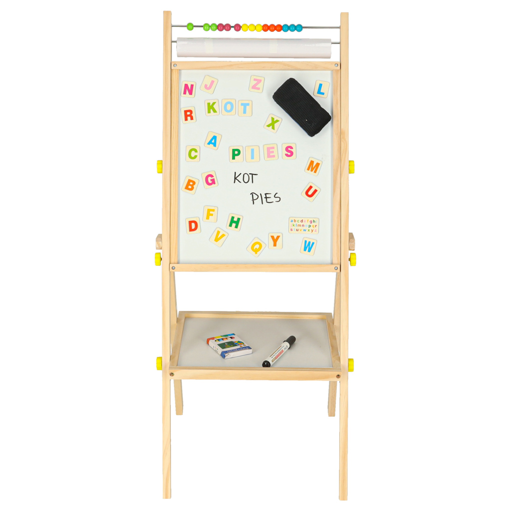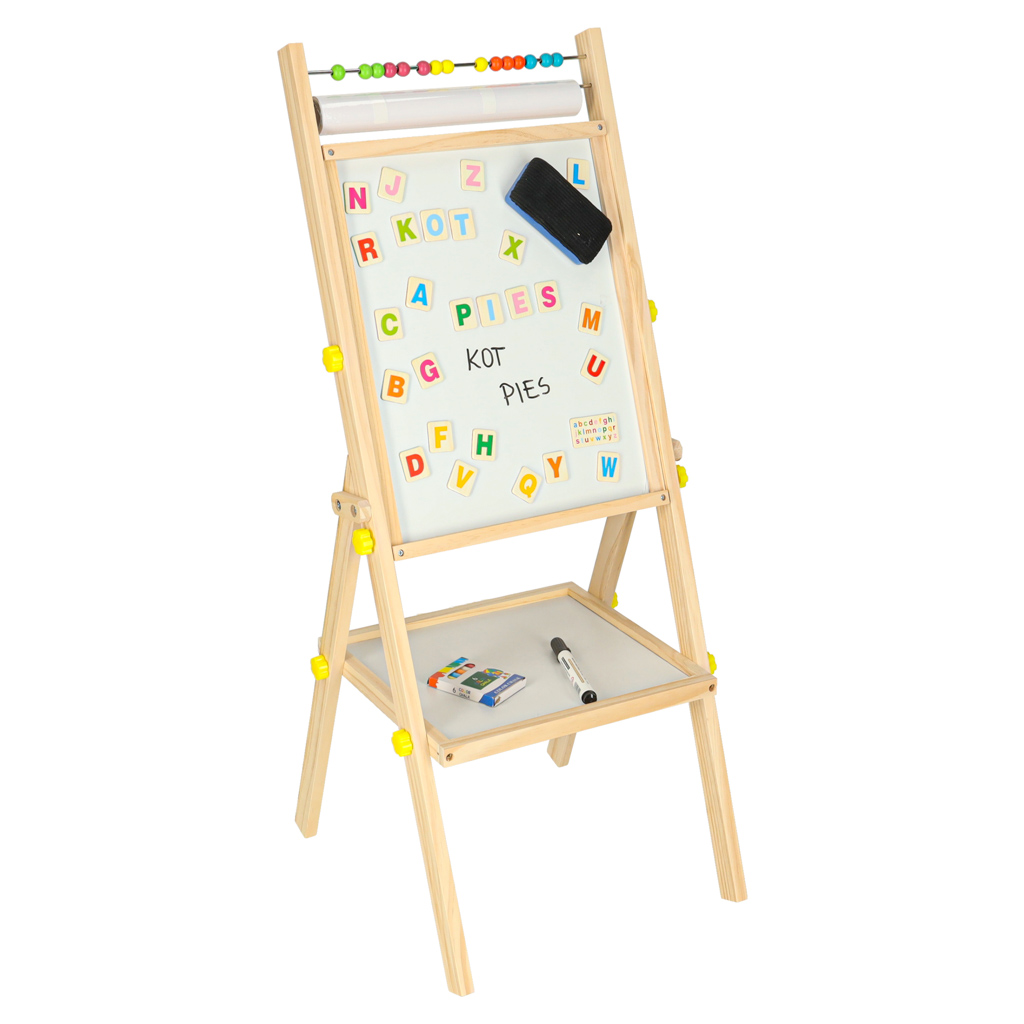 Obrotowa, dwustronna tablica magnetyczno-kredowa na drewnianym stelażu. Dodatkowo posiada liczydło i papier owinięty na rolkę. Nauka i zabawa w jednym. W zestawie: 25 literek-magnesów, czarny mazak, kreda w 5 kolorach i gąbka. Wymiary: 38×36,5x90cm.