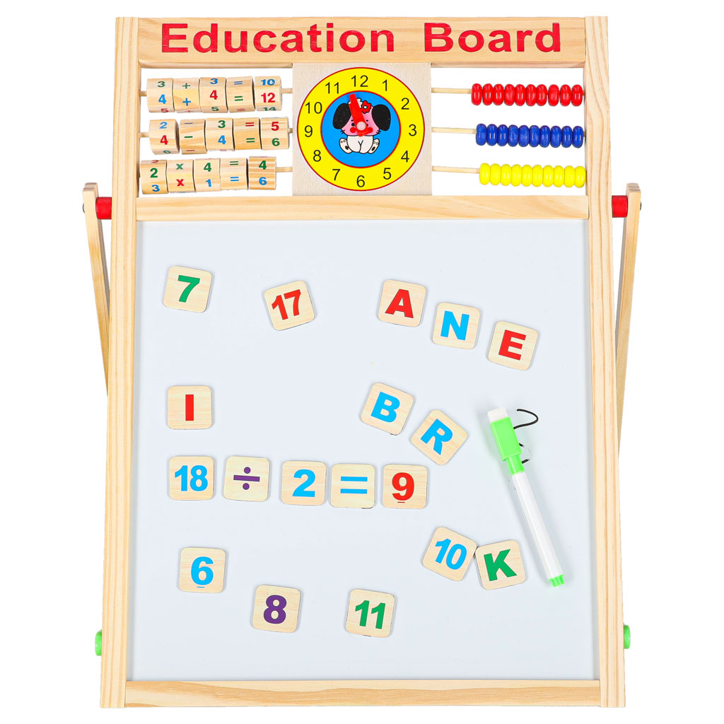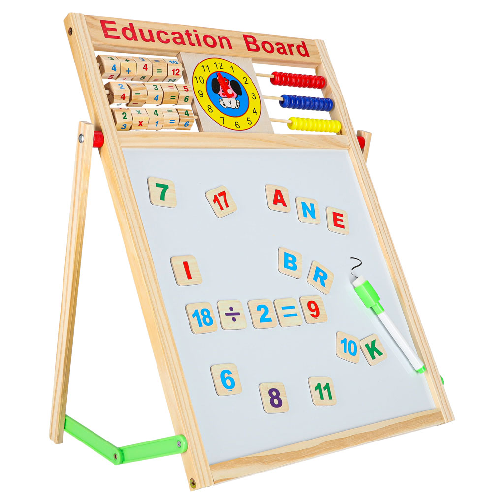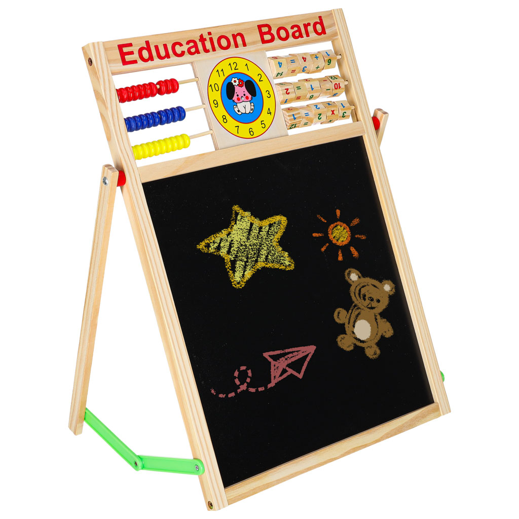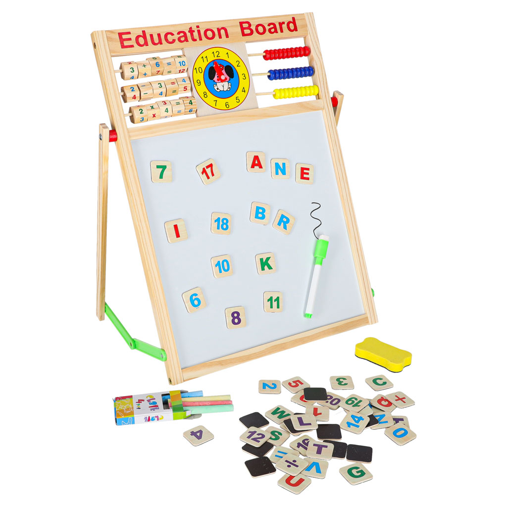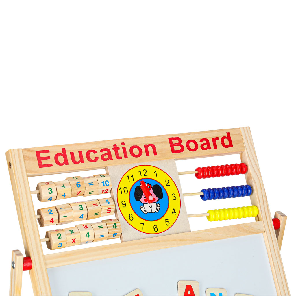 Dwustronna tablica z liczydłem.Tablica kredowo-magnetyczna służy do malowania kreda po czarnej str. i specjalnym mazakiem dołączonym do zestawu po białej str. Stelaż wykonany z drewna. Powierzchnia do pisania:28,5×28,5cm. Cała tablica:42x 32,5cm