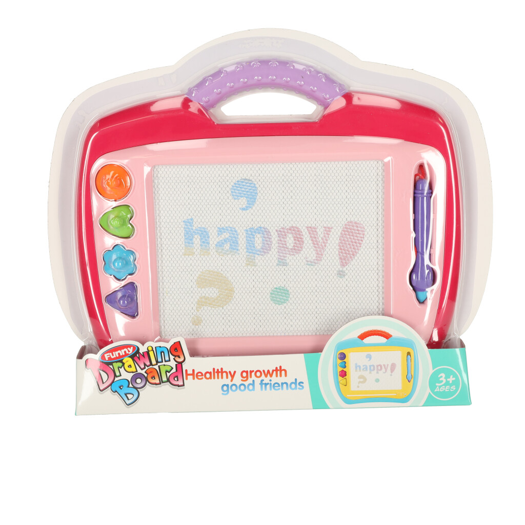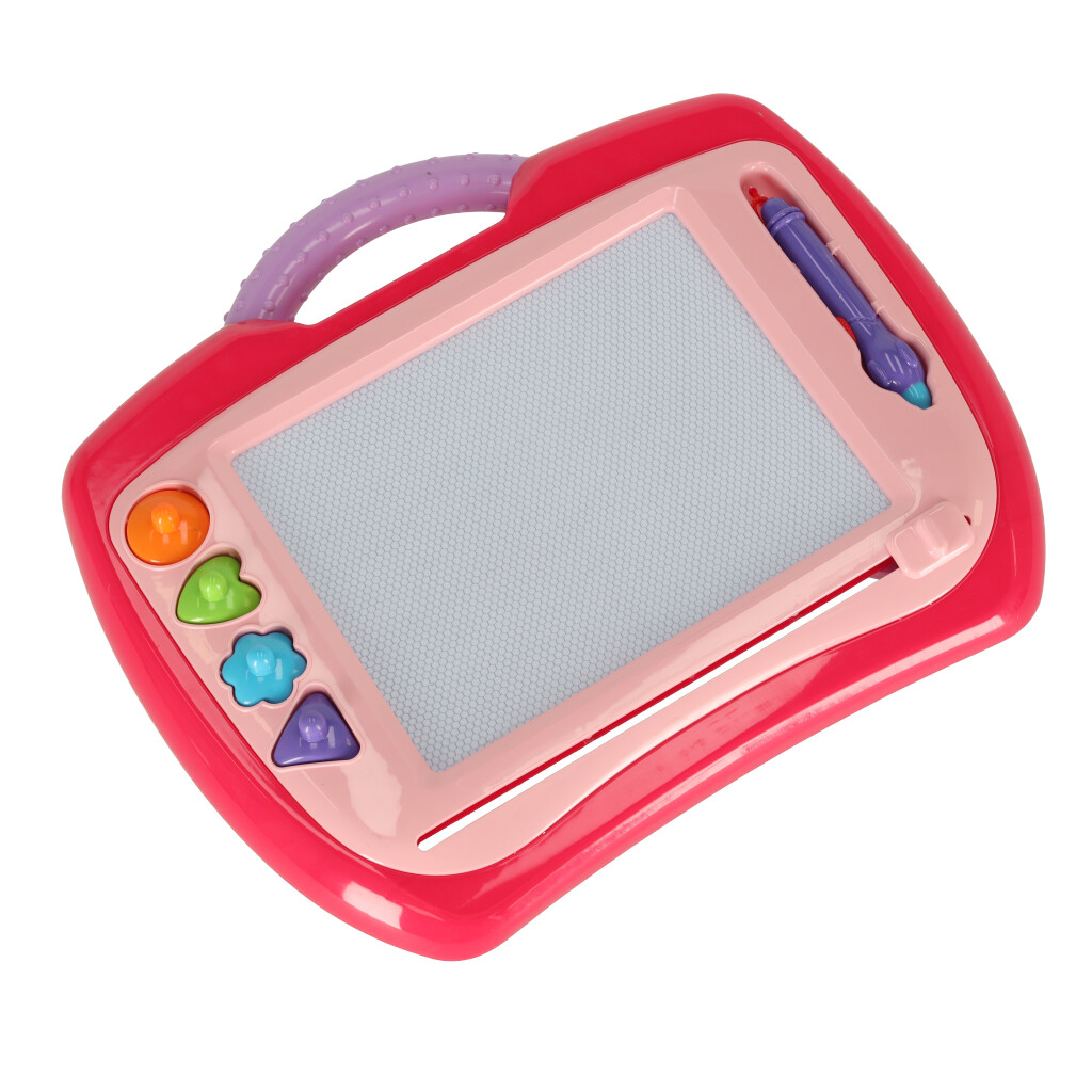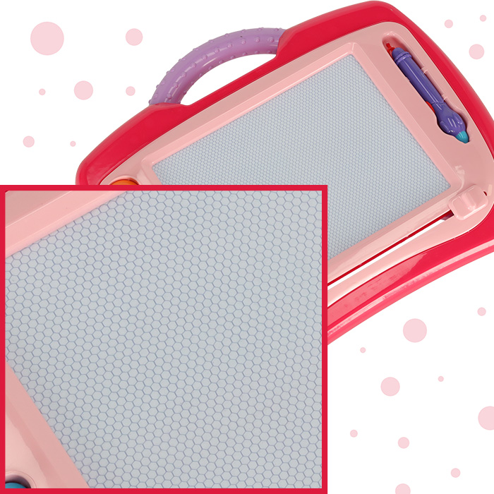 Różowa tablica do rysowania – znikopis! Dzięki temu produktowi dziecku nigdy nie skończy się miejsce na rysunki – wystarczy jeden ruch, a tablica ponownie będzie czysta. Rysik i stemple w zestawie. Tworzywo: plastik. Tablica: 35 x 30 x 2,5 cm.