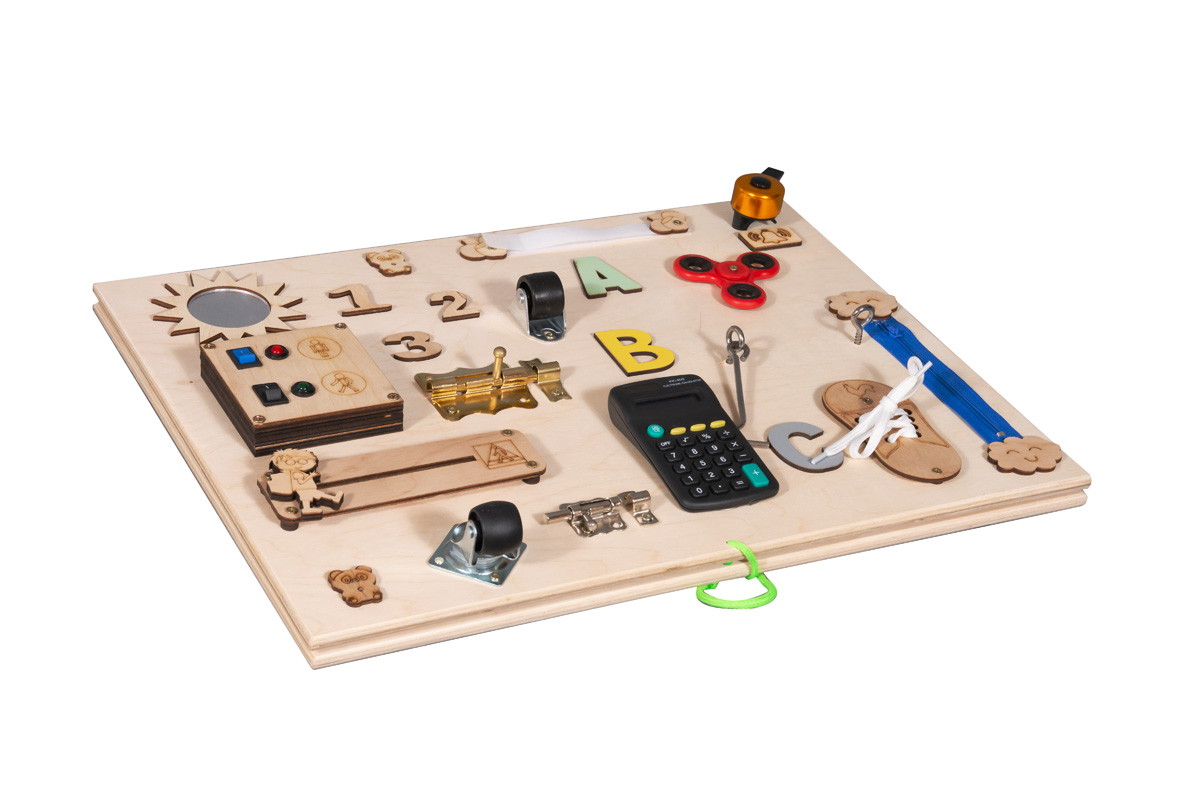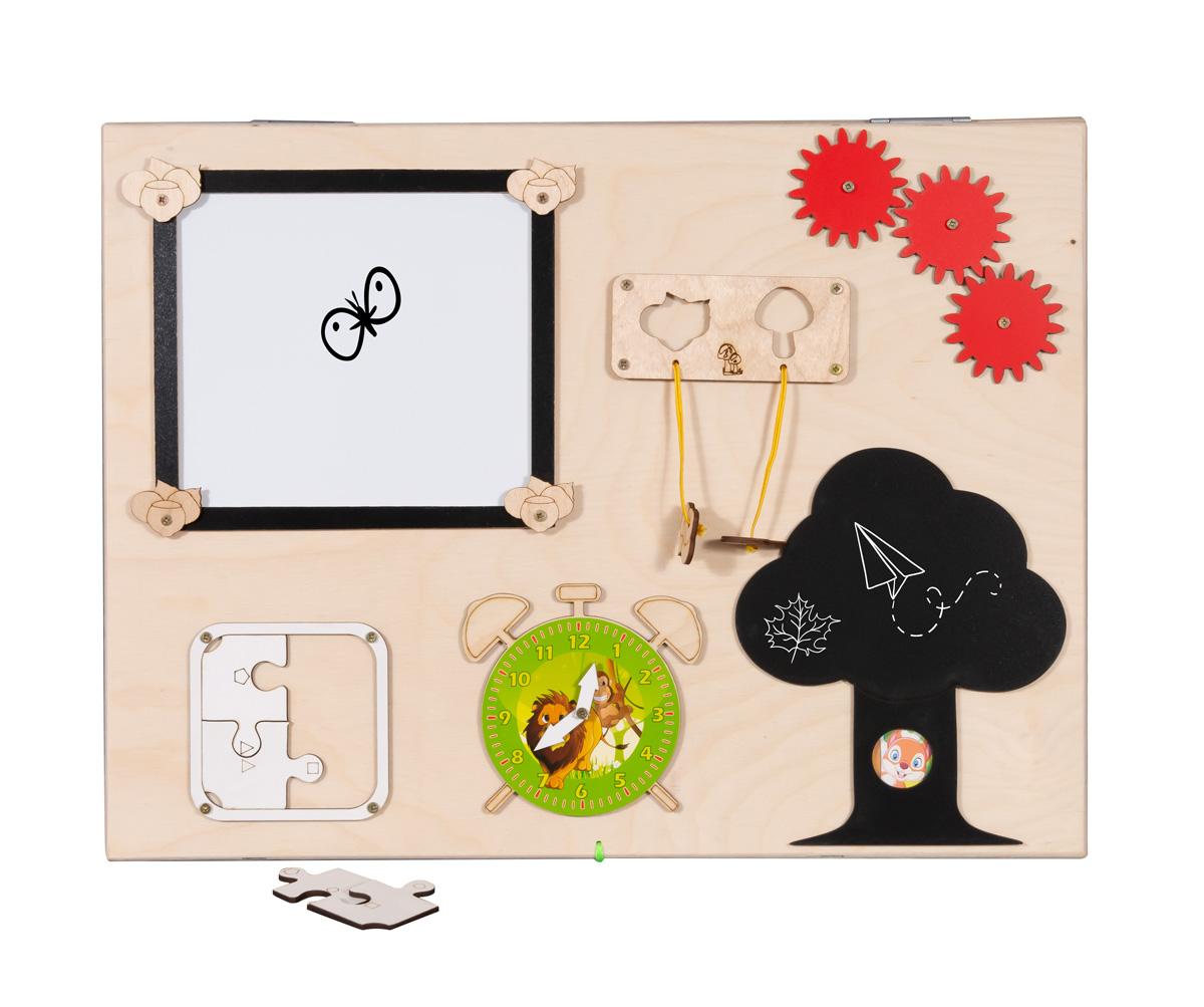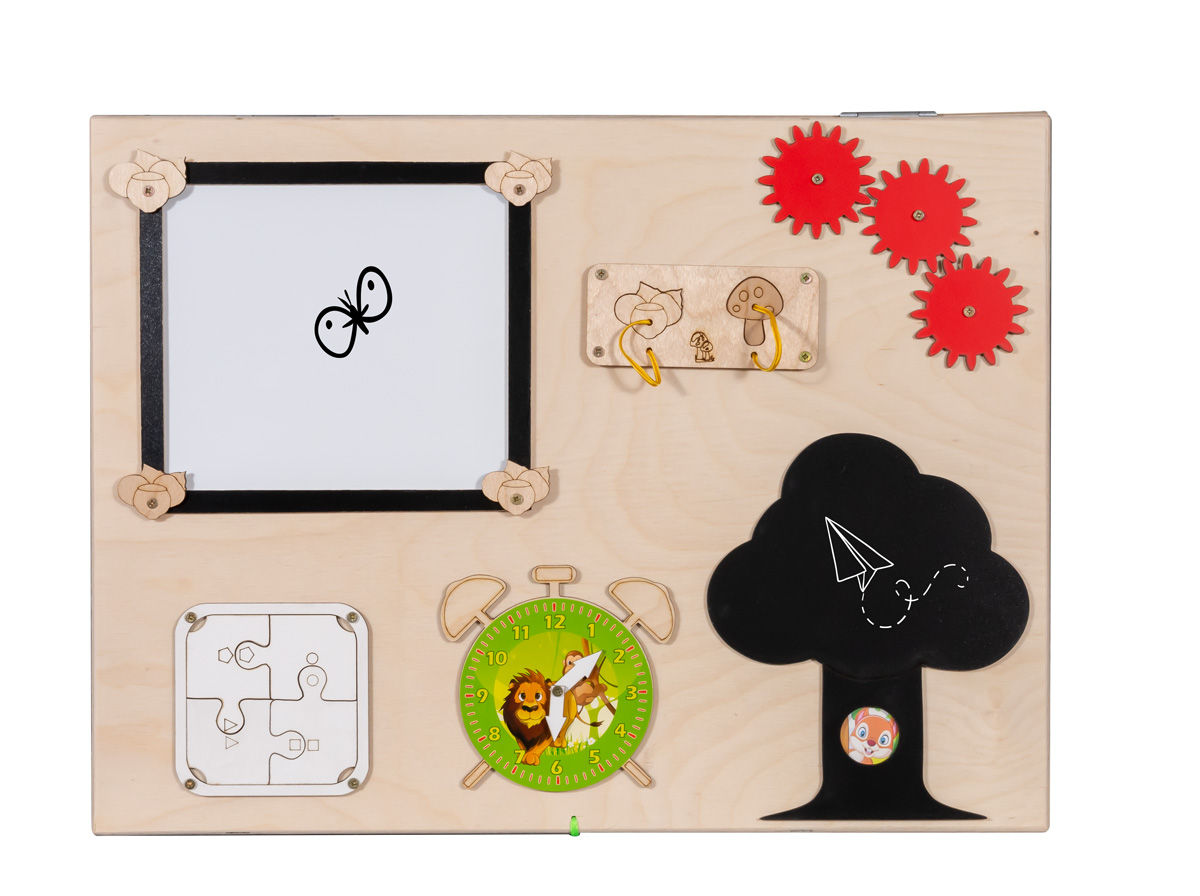 Drewniana tablica sensoryczna – aby zabawy było jeszcze więcej, tablica jest dwustronna. Przykładowe elementy zawarte na tablicy: puzzle, sorter, dzwonek rowerowy, spinner, zegar z ruchomymi wskazówkami i wiele innych. Wym.: 50 cm x 37,5 cm x 32 cm.