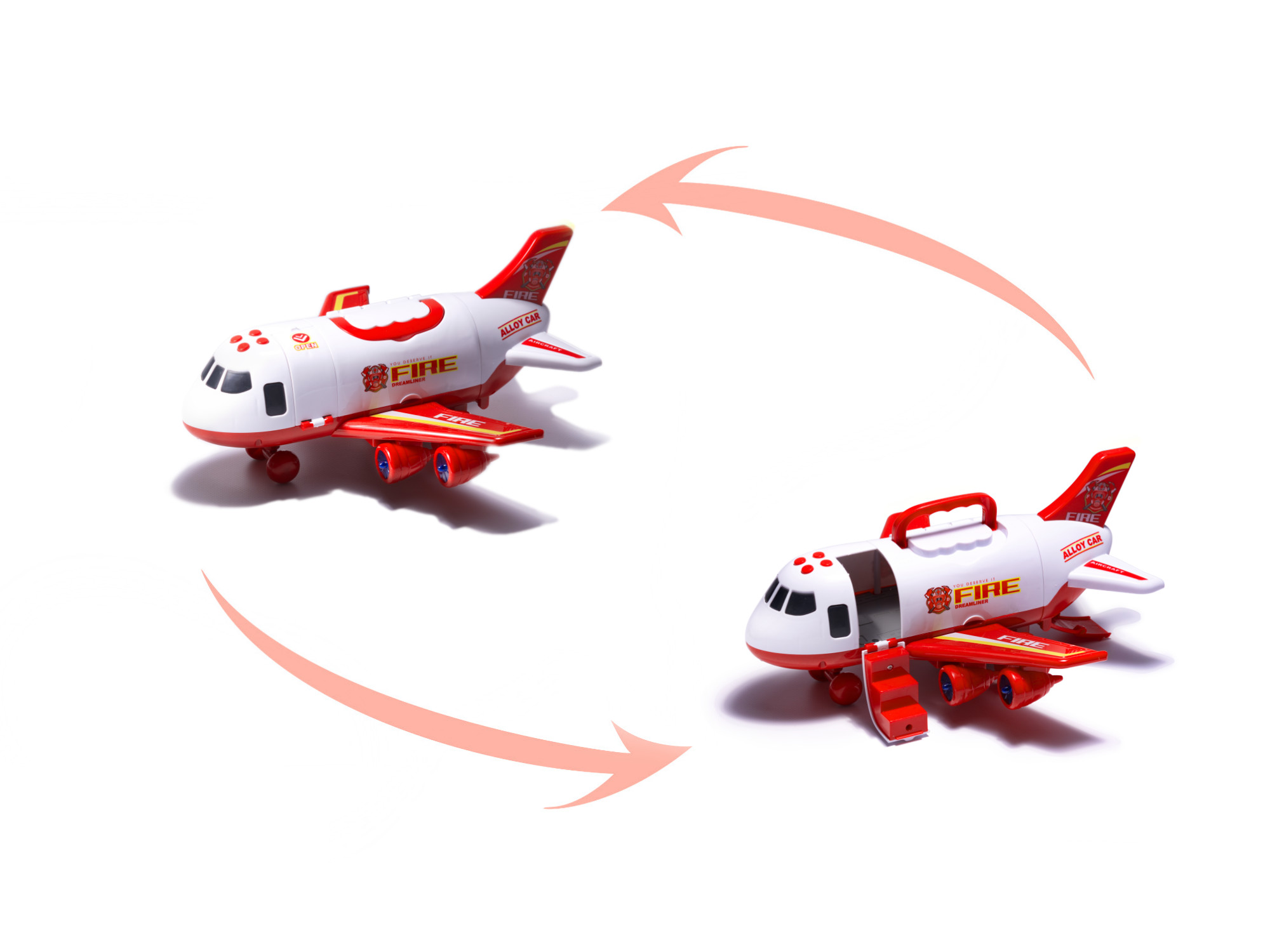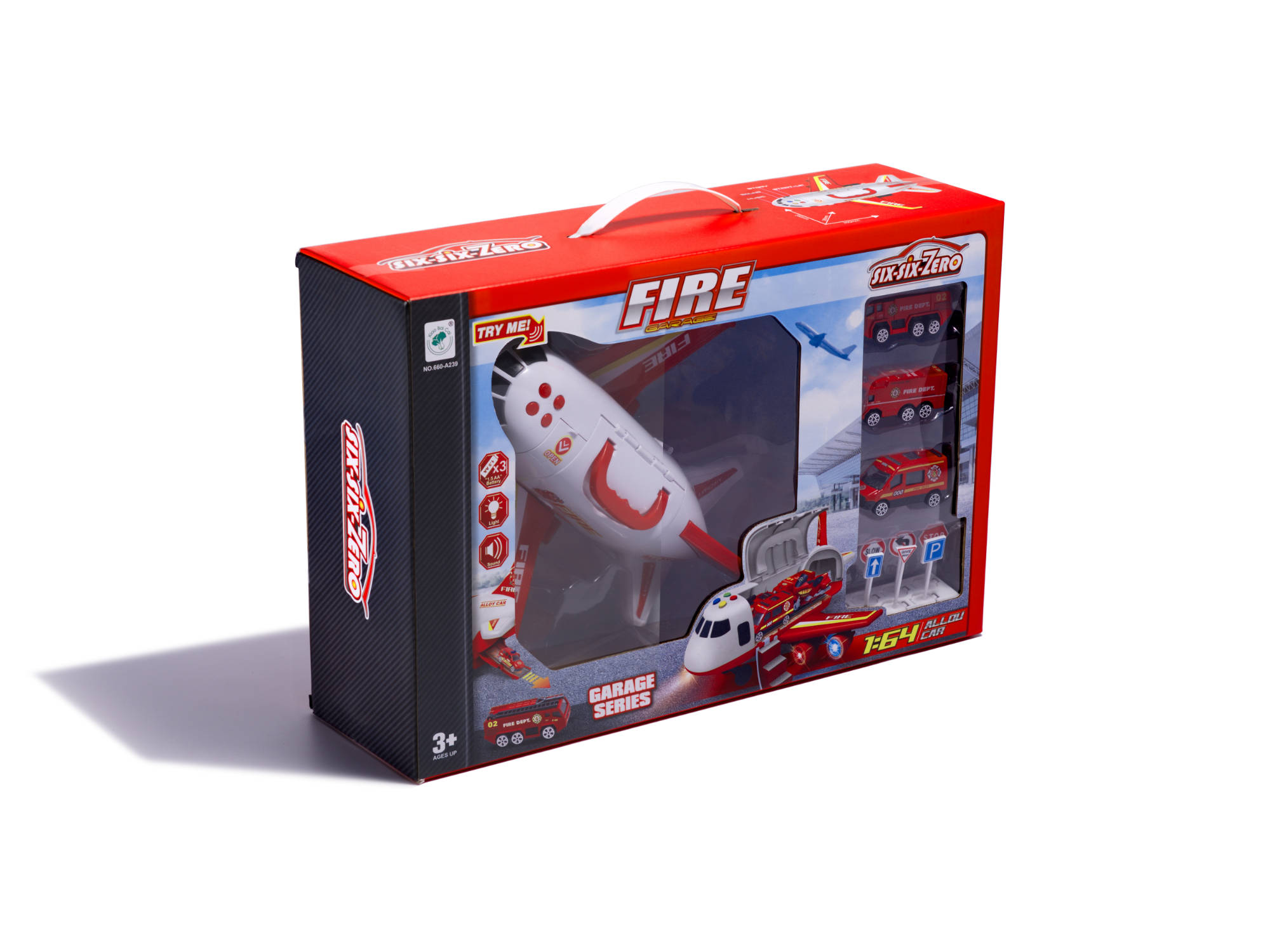Zestaw pojazdów strażackich w samolocie z ruchomymi elementami. Komplet zawiera wóz strażacki, transporter, wóz miejski i 7 znaków drogowych. Samolot posiada cztery sygnały dźwiękowe i diody LED. Wymiary: samolot – 30x25x14cm, auta – 7,5×2,5×2,5cm.