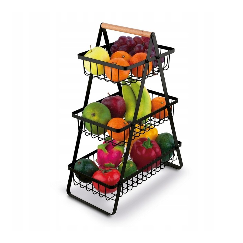 Praktyczna trzypoziomowa półka na owoce i warzywa. Można przechowywać w nich rzeczy kuchenne, łazienkowe, a także drobne akcesoria.
