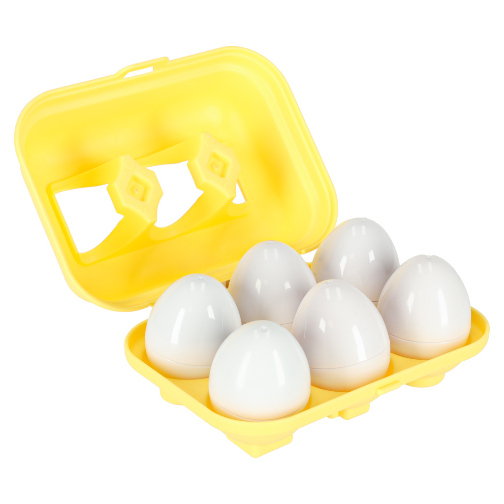 Układanka edukacyjna dla dzieci 18msc+: 6 plastikowych jajek o wym. 4,5×6 cm w wytłaczance 16,5×12×7,5 cm. Każde jajko zawiera dopasowywane kolorowe kształty. Materiał: tworzywo sztuczne. Funkcje: sorter, nauka kolorów i kształtów, rozwój koordynacji