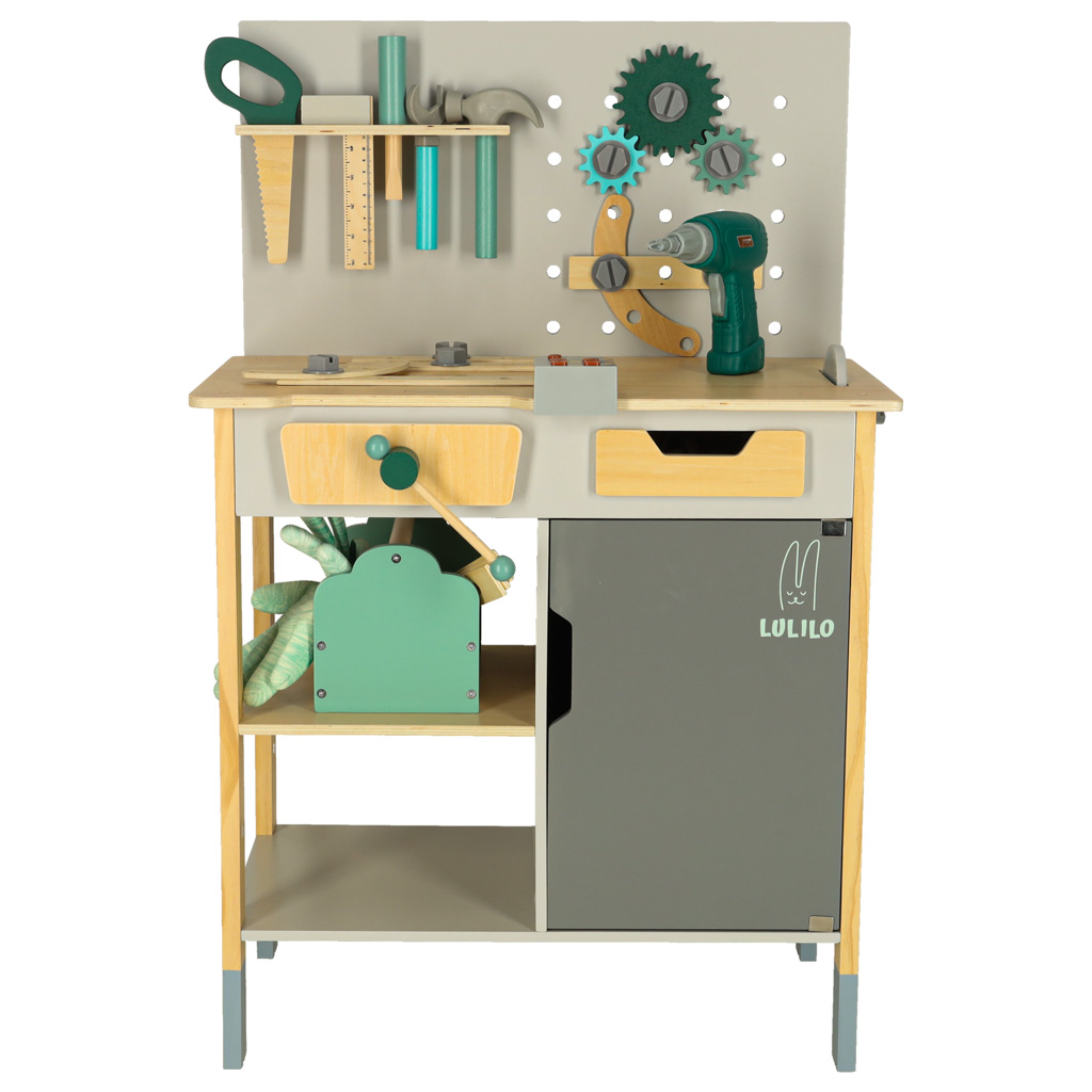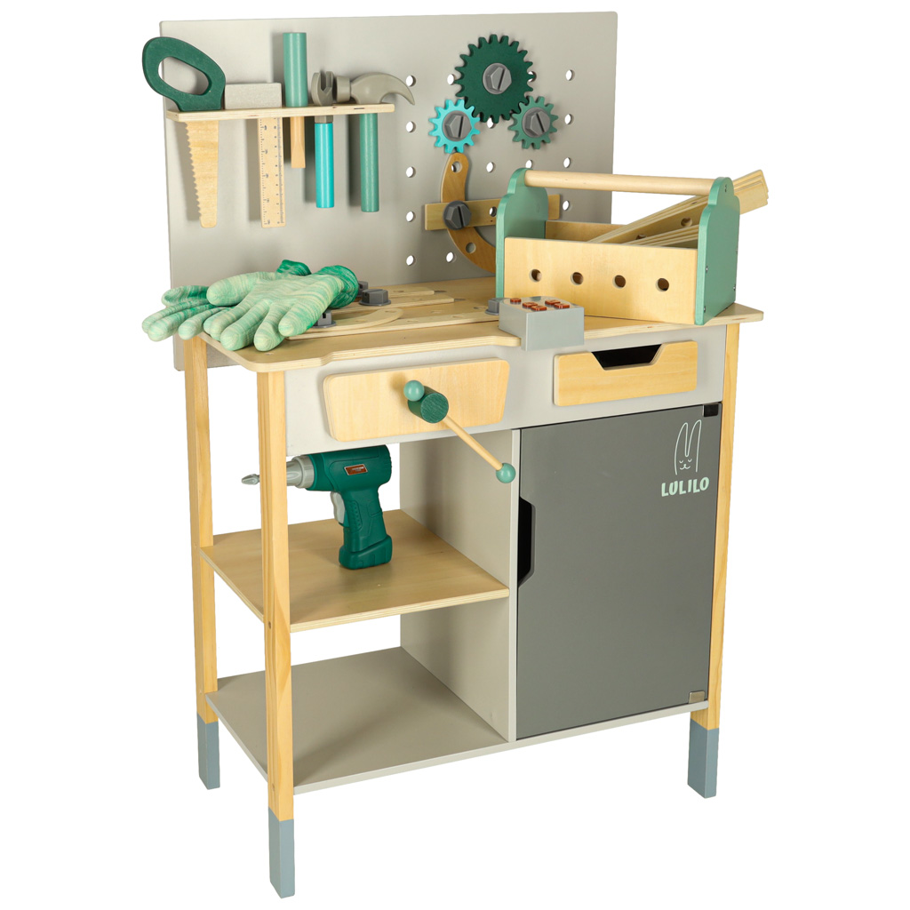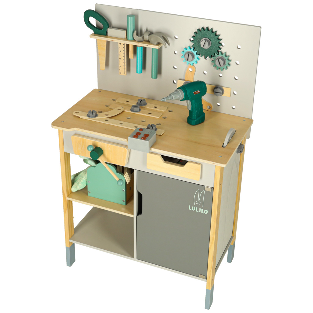 Warsztat drewniany LULILO Fikso zestaw małego majsterkowicza z narzędziami piła wkrętarka dźwięki 86cm