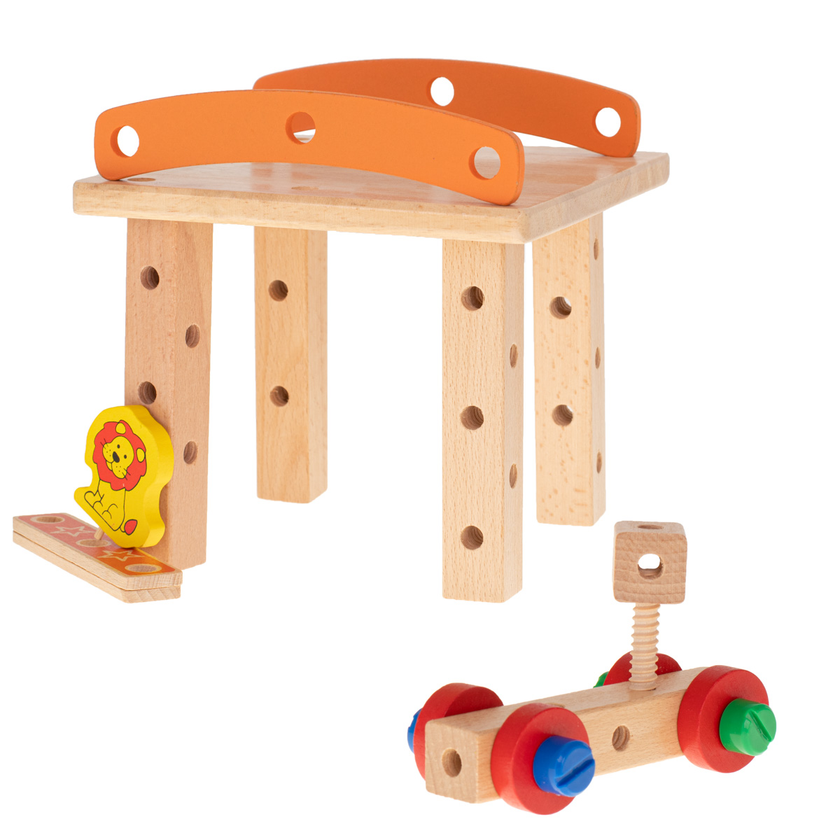 Drewniany, wieloelementowy zestaw konstrukcyjny dla majsterkowiczów. Można zbudować różne konstrukcje, a nawet krzesełko. Zestaw zawiera 49 części do złożenia i akcesoria. Tworzywo: drewno i plastik. Wymiary: wysokość – 27cm, siedzisko – 17x17cm.