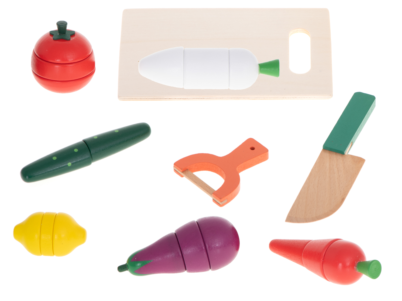 Drewniane warzywa na magnes z akcesoriami. Wspaniała zabawa dla najmłodszych. Krojenie nożykiem to świetne ćwiczenie koordynacji wzrokowo-ruchowej. W zestawie: warzywa, deska, nożyk, obieraczka. Wym. skrzynki: 22,5×13,5×9,5cm. Wym. deski: 17,5×10,5×0,5cm.