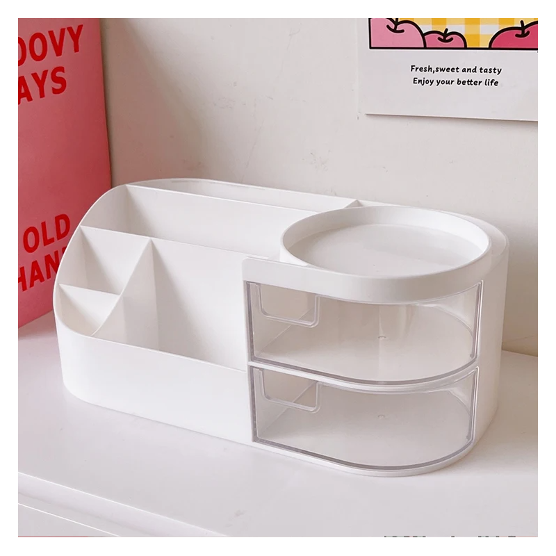 – Praktyczny: 2 wysuwane szufladki oraz przegródki w górnej części, które pomieszczą pędzelki, karteczki, kosmetyki, perfumy, biżuterię itp.