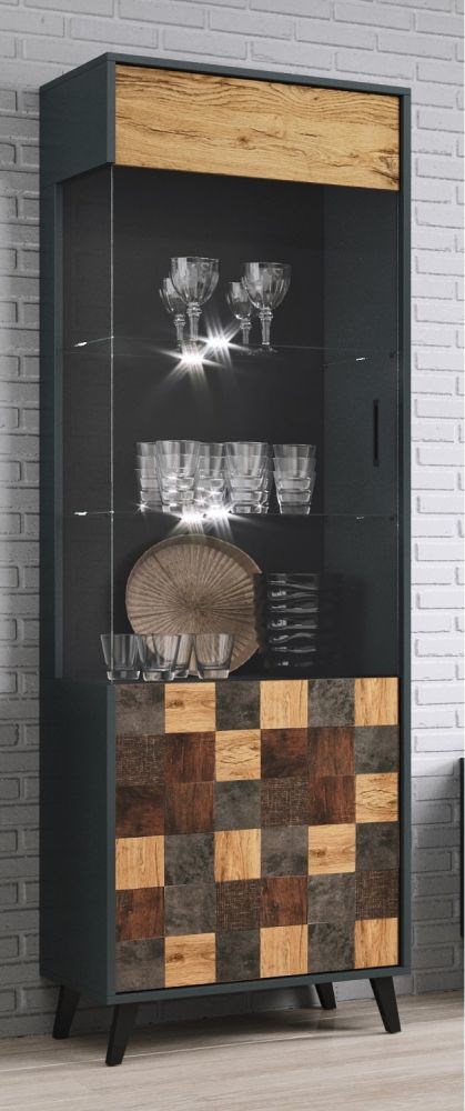 Meble do samodzielnego montażu, Kolor: korpus antracyt, fronty dekor, Zdjęcia zestawów przedstawiają przykładową aranżację z innymi meblami z kolekcji. Pozostałe bryły są dostępne w osobnej sprzedaży., Istnieje możliwość dokupienia oświetlenia szafkowego LED., Nóżki: czarny mat, wysokość 12 cm ( podana wysokość razem z wysokością nóżek)