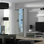 Montaż drzwi uniwersalny (prawo/lewo), Opcjonalne oświetlenie LED półek (za dopłatą), Istnieje możliwość dokupienia oświetlenia szafkowego LED., Zdjęcia zestawów przedstawiają przykładową aranżację z innymi meblami z kolekcji. Pozostałe bryły są dostępne w osobnej sprzedaży., Płyta wiórowa laminowana wyróżnia się odpornością na naprężenia mechaniczne i ekstremalne temperatury, Dostępne kolory podświetlenia: biały zimny, czerwony, niebieski, zielony, Meble do samodzielnego montażu