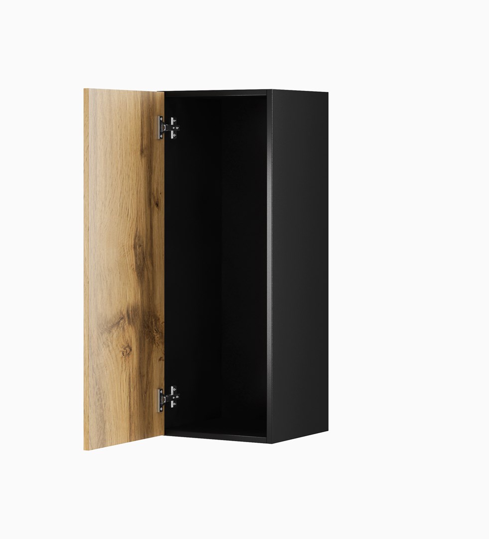 Wewnątrz jedna komora, Bezuchwytowe fronty, Jeden front otwierany do boku, Meble do samodzielnego montażu, Szafka podwieszana, Zdjęcia zestawów przedstawiają przykładową aranżację z innymi meblami z kolekcji. Pozostałe bryły są dostępne w osobnej sprzedaży., Możliwość wieszania w poziomie lub w pionie