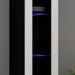 Istnieje możliwość dokupienia oświetlenia szafkowego LED., Płyta wiórowa laminowana wyróżnia się odpornością na naprężenia mechaniczne i ekstremalne temperatury, Bezuchwytowe fronty, Front przeszklony, Opcjonalne oświetlenie LED półek (za dopłatą), Szafka podwieszana, Zdjęcia zestawów przedstawiają przykładową aranżację z innymi meblami z kolekcji. Pozostałe bryły są dostępne w osobnej sprzedaży., Dostępne kolory podświetlenia: biały zimny, czerwony, niebieski, zielony, Meble do samodzielnego montażu, Możliwość wieszania w poziomie lub w pionie