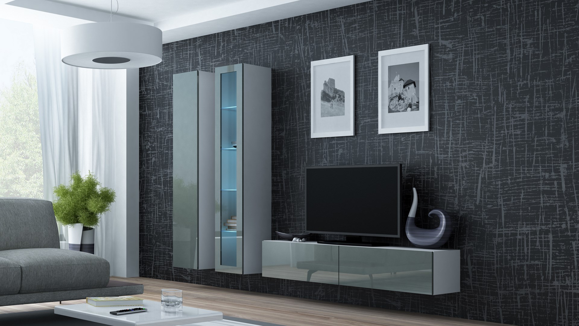 Wewnątrz cztery półki, Dostępne kolory podświetlenia: biały zimny, czerwony, niebieski, zielony, Płyta wiórowa laminowana wyróżnia się odpornością na naprężenia mechaniczne i ekstremalne temperatury, Bezuchwytowe fronty, Front przeszklony, Opcjonalne oświetlenie LED półek (za dopłatą), Meble do samodzielnego montażu, Istnieje możliwość dokupienia oświetlenia szafkowego LED., Szafka podwieszana, Zdjęcia zestawów przedstawiają przykładową aranżację z innymi meblami z kolekcji. Pozostałe bryły są dostępne w osobnej sprzedaży.