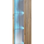 Wewnątrz cztery półki, Meble do samodzielnego montażu, Zdjęcia zestawów przedstawiają przykładową aranżację z innymi meblami z kolekcji. Pozostałe bryły są dostępne w osobnej sprzedaży., Bezuchwytowe fronty, Front przeszklony, Opcjonalne oświetlenie LED półek (za dopłatą), Dostępne kolory podświetlenia: biały zimny, czerwony, niebieski, zielony, Szafka podwieszana, Istnieje możliwość dokupienia oświetlenia szafkowego LED., Płyta wiórowa laminowana wyróżnia się odpornością na naprężenia mechaniczne i ekstremalne temperatury