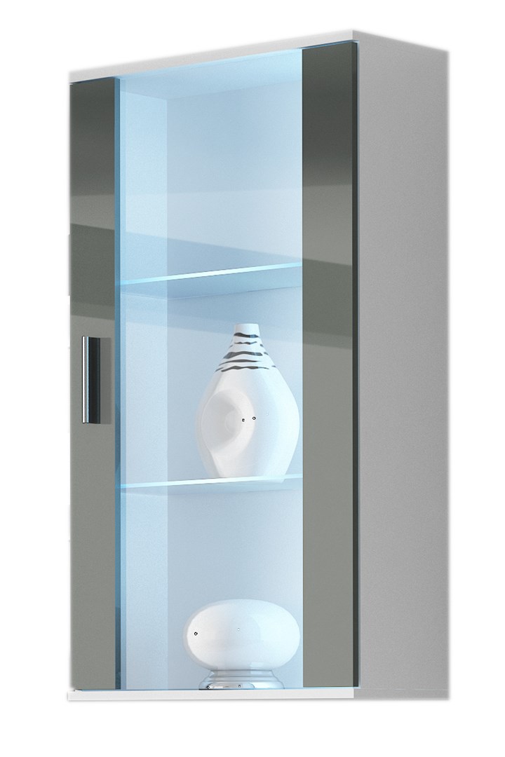 Front przeszklony, Opcjonalne oświetlenie LED półek (za dopłatą), Dostępne kolory podświetlenia: biały zimny, czerwony, niebieski, zielony, Płyta wiórowa laminowana wyróżnia się odpornością na naprężenia mechaniczne i ekstremalne temperatury, Zdjęcia zestawów przedstawiają przykładową aranżację z innymi meblami z kolekcji. Pozostałe bryły są dostępne w osobnej sprzedaży., Szafka podwieszana, Możliwość wyboru strony otwierania drzwiczek – lewostronnie/prawostronnie - bezpośrednio przy montażu, Meble do samodzielnego montażu
