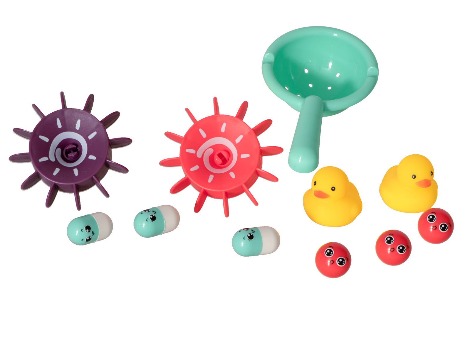 Kreatywny zestaw Tor ze zjeżdżalnią. Idealny dla wszystkich maluchów do zabawy podczas kąpieli. W zestawie m.in.: części do budowy toru, gumowe kaczki, kulki, fasolki i sitko. Materiał: plastik. Wym. przykładowego toru: 40x40x12cm. Wym. kaczki: 6×4,5x5cm.