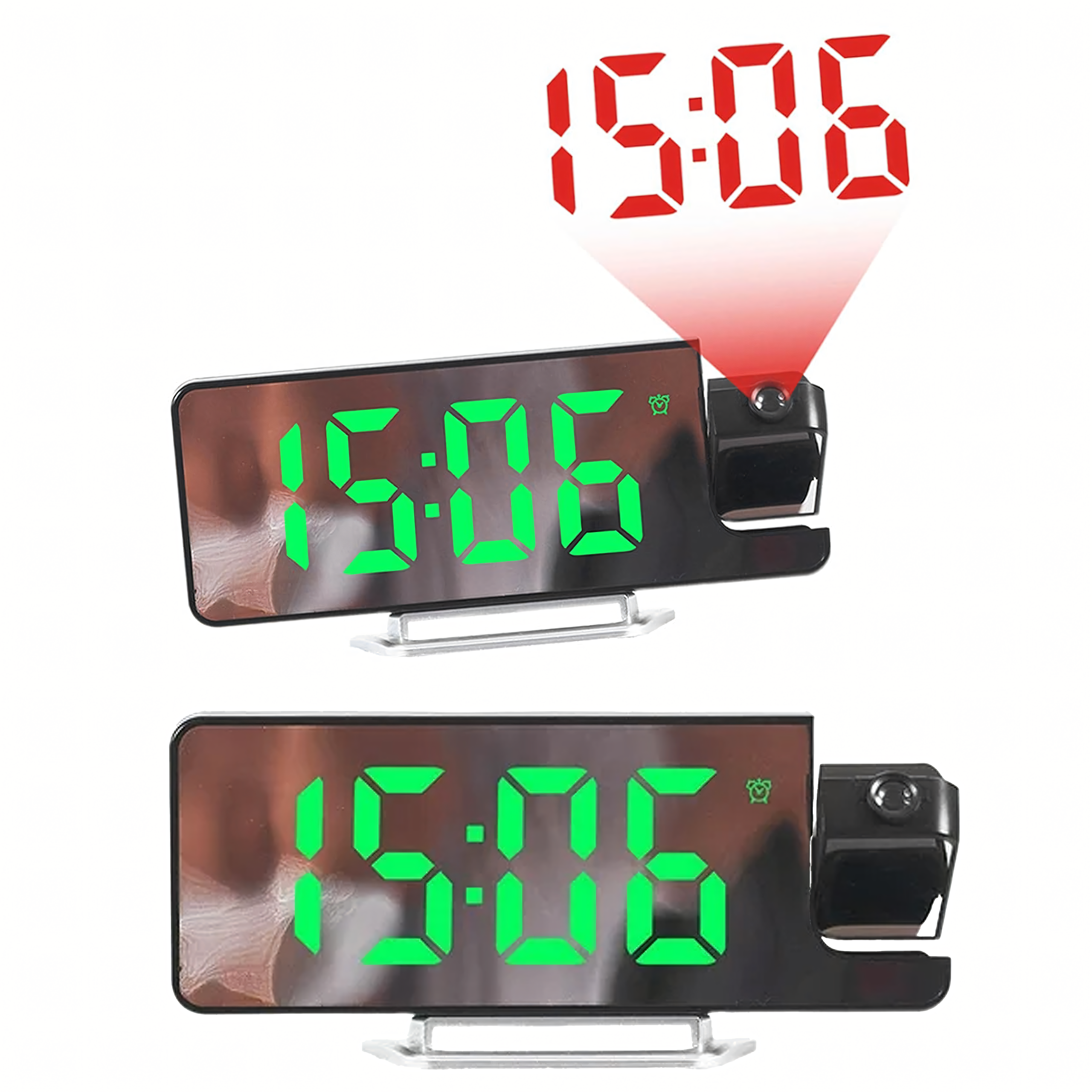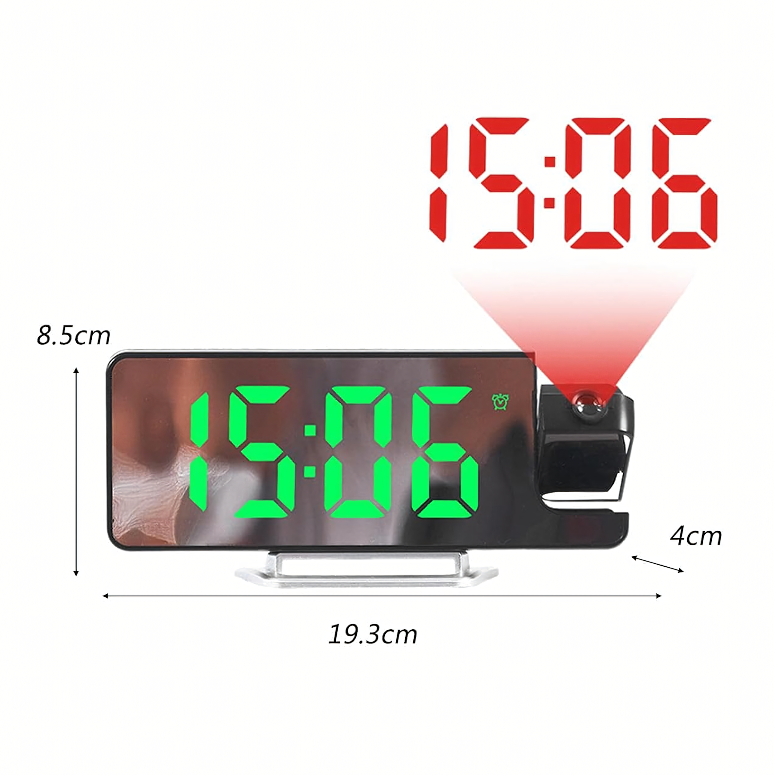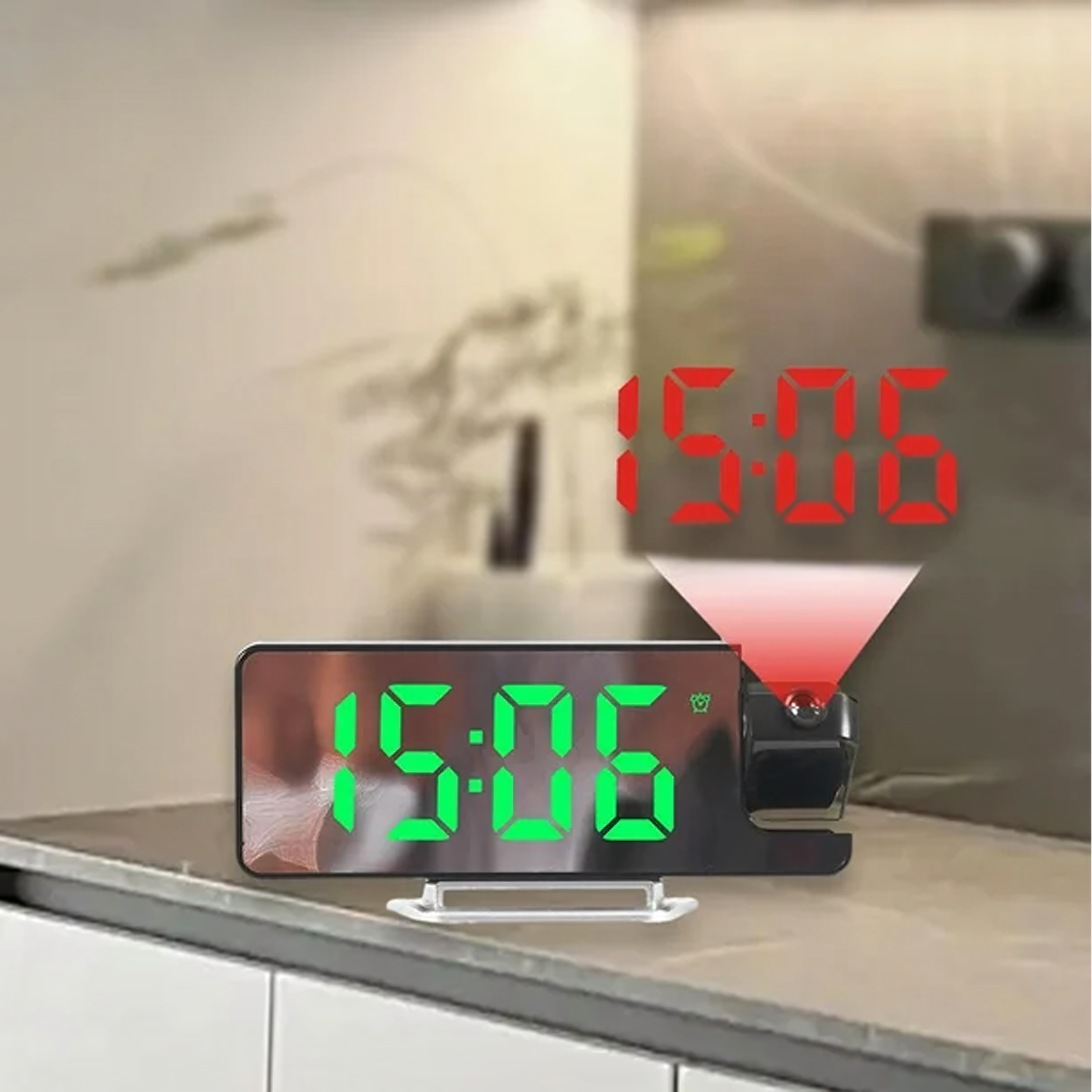 Nowoczesny zegar LED z projektorem – wyraźna projekcja godziny na ścianę lub sufit, wbudowany czujnik temperatury, budzik z funkcją drzemki i regulowany kąt projekcji. Data, godzina i temperatura w jednym – idealny do sypialni, biura lub jako prezent.