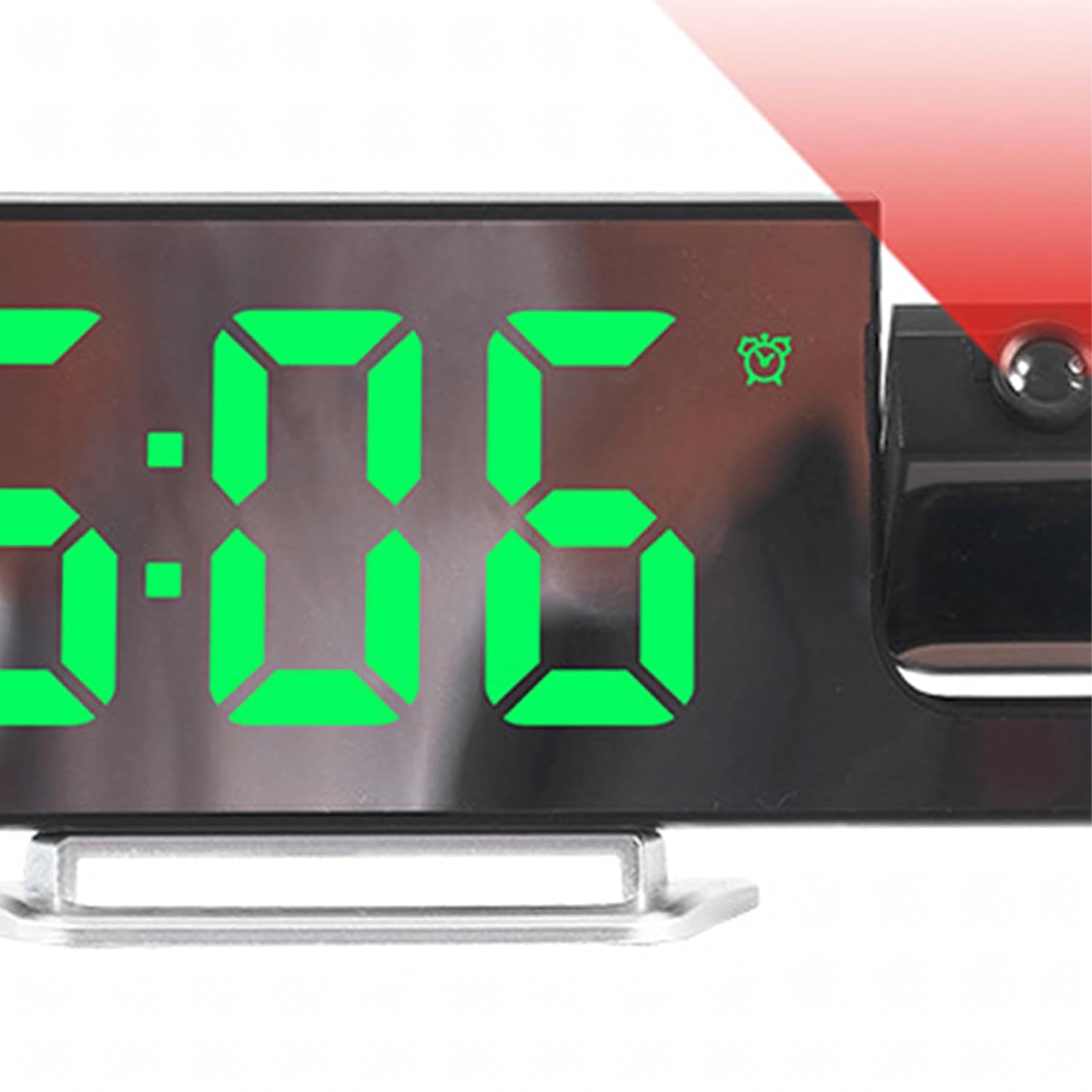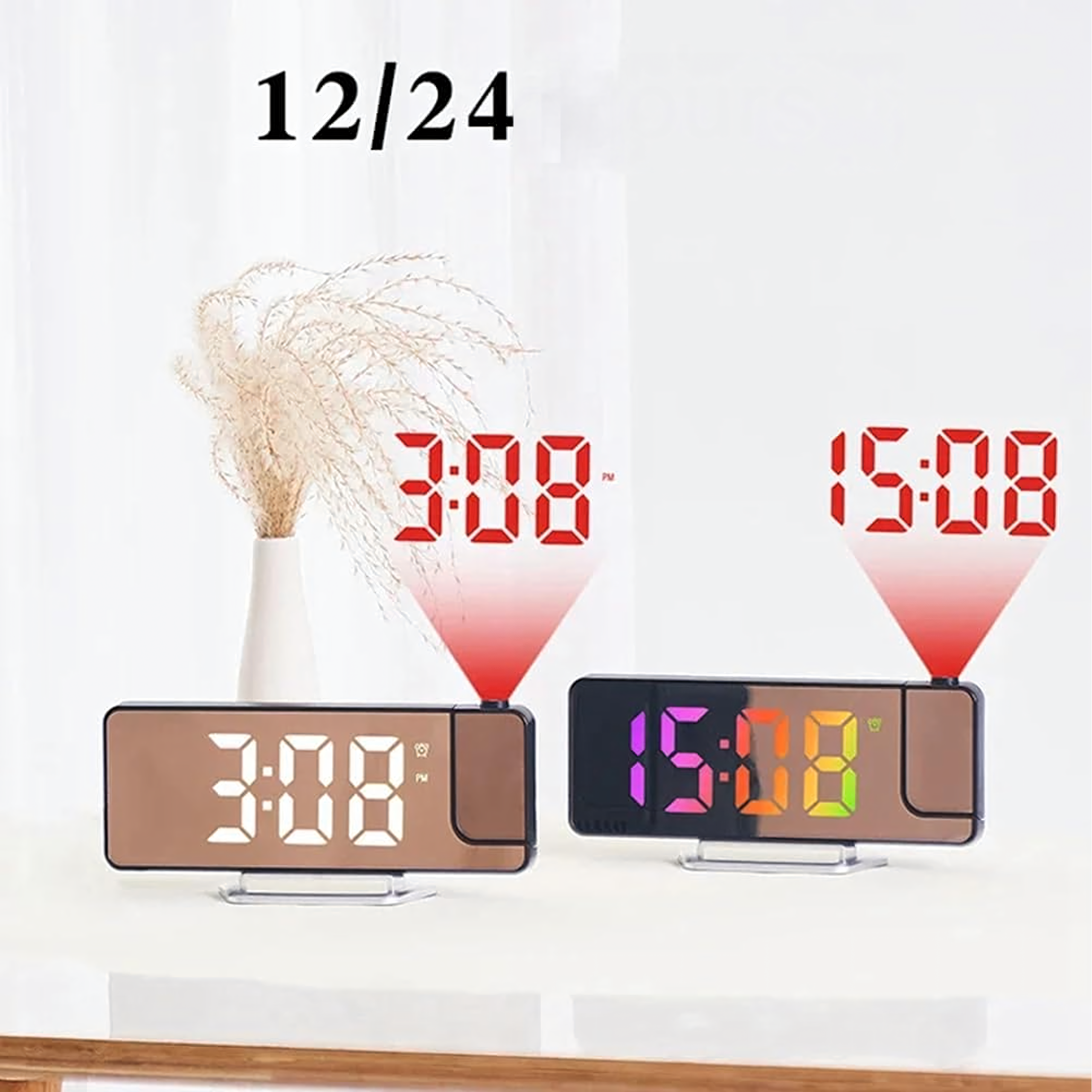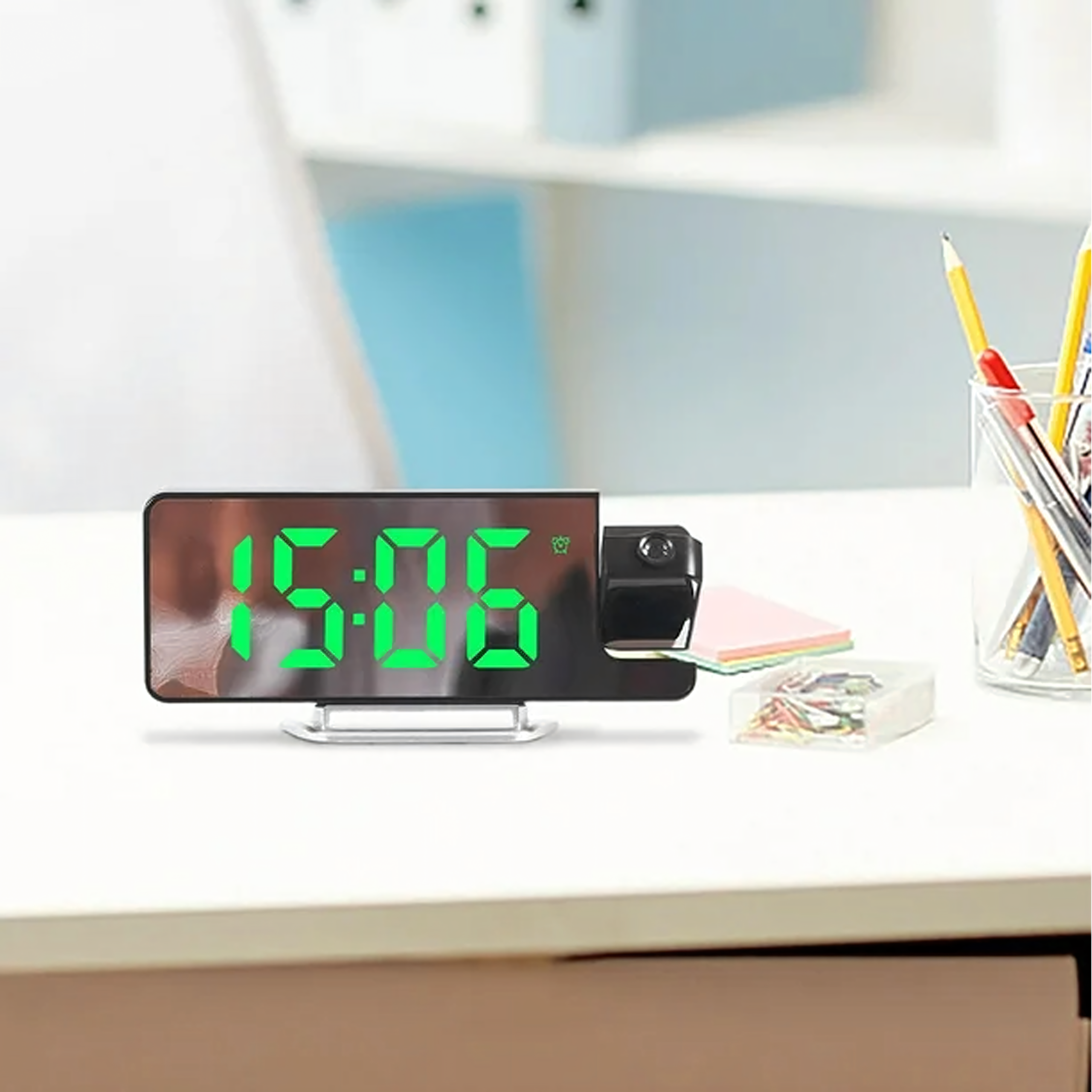 Nowoczesny zegar LED z projektorem – wyraźna projekcja godziny na ścianę lub sufit, wbudowany czujnik temperatury, budzik z funkcją drzemki i regulowany kąt projekcji. Data, godzina i temperatura w jednym – idealny do sypialni, biura lub jako prezent.