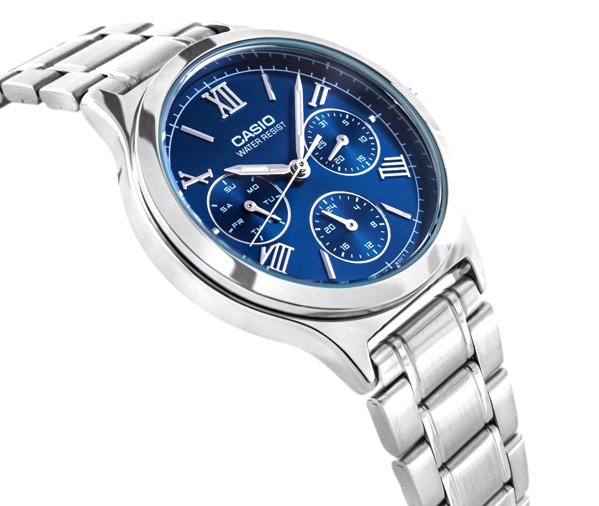 Ten zegarek CASIO to prawdziwa perła wśród damskich dodatków – hipnotyzuje głęboką, kobaltową tarczą, która w zależności od światła mieni się niczym tafla jeziora o zmierzchu. Delikatne rzymskie indeksy i smukłe wskazówki nadają mu klasy, a srebrna bransoleta z połyskiem subtelnie podkreśla kobiecy nadgarstek. Trzy małe tarcze dbają o codzienną organizację – pokazując dzień tygodnia, datę i czas 24-godzinny. To połączenie elegancji, funkcjonalności i zmysłowego uroku, stworzone dla kobiet, które kochają detale z charakterem.