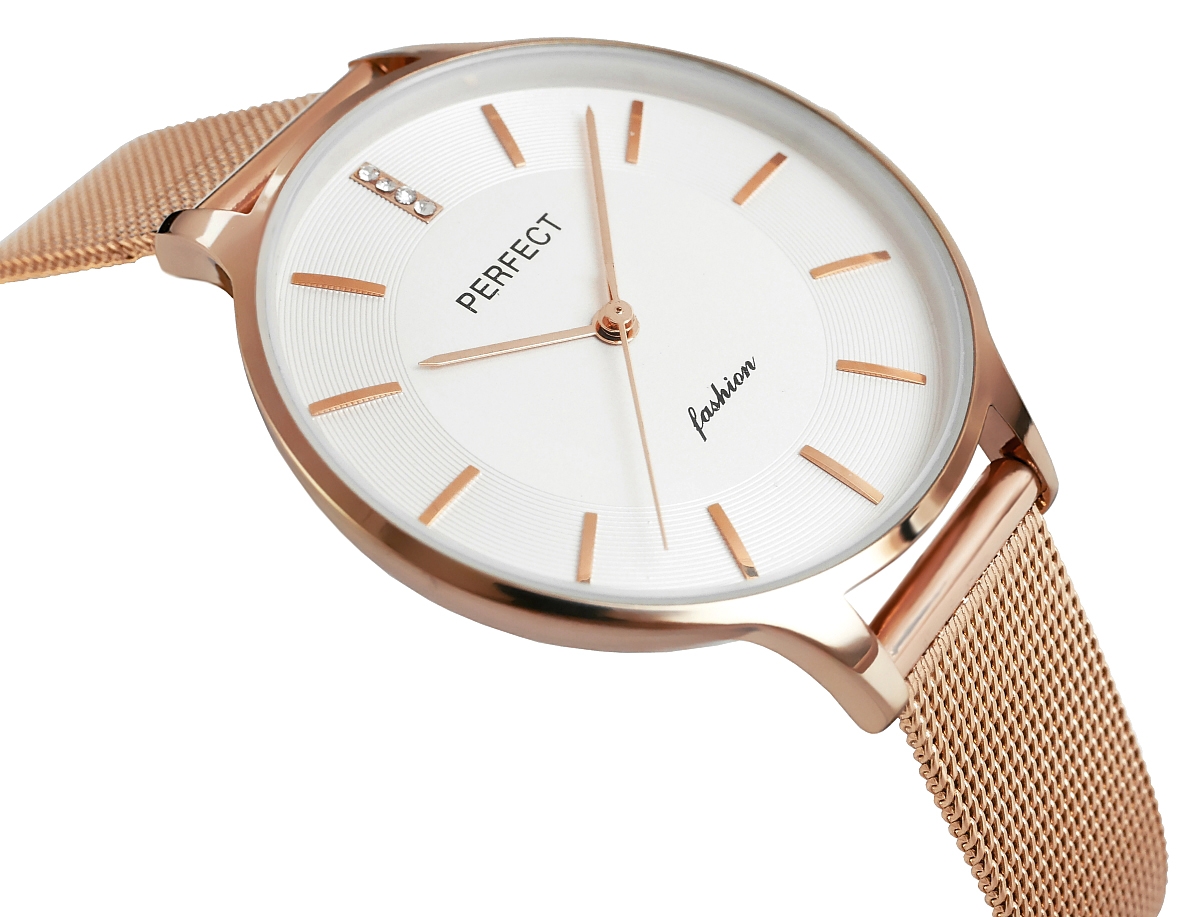 Wykonana z wysokiej jakości stali, idealnie dopasowuje się do damskiego nadgarstka, zapewniając wygodę noszenia przez cały dzień. Jej elegancka struktura i zapięcie ozdobione logiem marki Perfect dodają zegarkowi wyjątkowego stylu i wyróżniają go na tle innych.