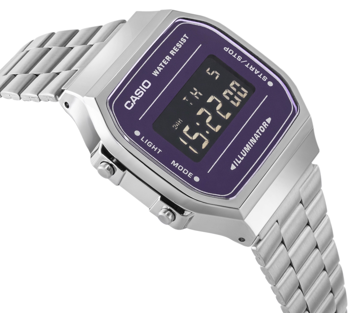 Nie potrzebujesz krzykliwych dodatków, by zwrócić na siebie uwagę. Klasyczna sylwetka Casio spotyka się tu z nowoczesnym wykończeniem – lustrzana tarcza w metalicznym fiolecie przyciąga wzrok, odbijając światło z charakterystycznym połyskiem, który robi wrażenie w każdej sytuacji – od biura po wieczorne wyjście. Model posiada standardowe wskazanie czasu (cyfrowe): godzina, minuta, sekunda, oznaczenie pory dnia (PM), data, dzień tygodnia. A gdy przychodzi moment działania – ma wszystko, czego trzeba. Stoper 1/100 sekundy, funkcja międzyczasów, codzienny alarm i sygnał godzinowy – praktyczne narzędzia w zgrabnym wydaniu. Wieczorem, gdy światło przygasa, wystarczy jedno naciśnięcie – elektroluminescencyjne podświetlenie w odcieniu niebieskozielonym rozjaśni tarczę i nada jej niepowtarzalnego klimatu. Model posiada również odporność na zachlapania – bo życie nie pyta, czy masz parasol.
