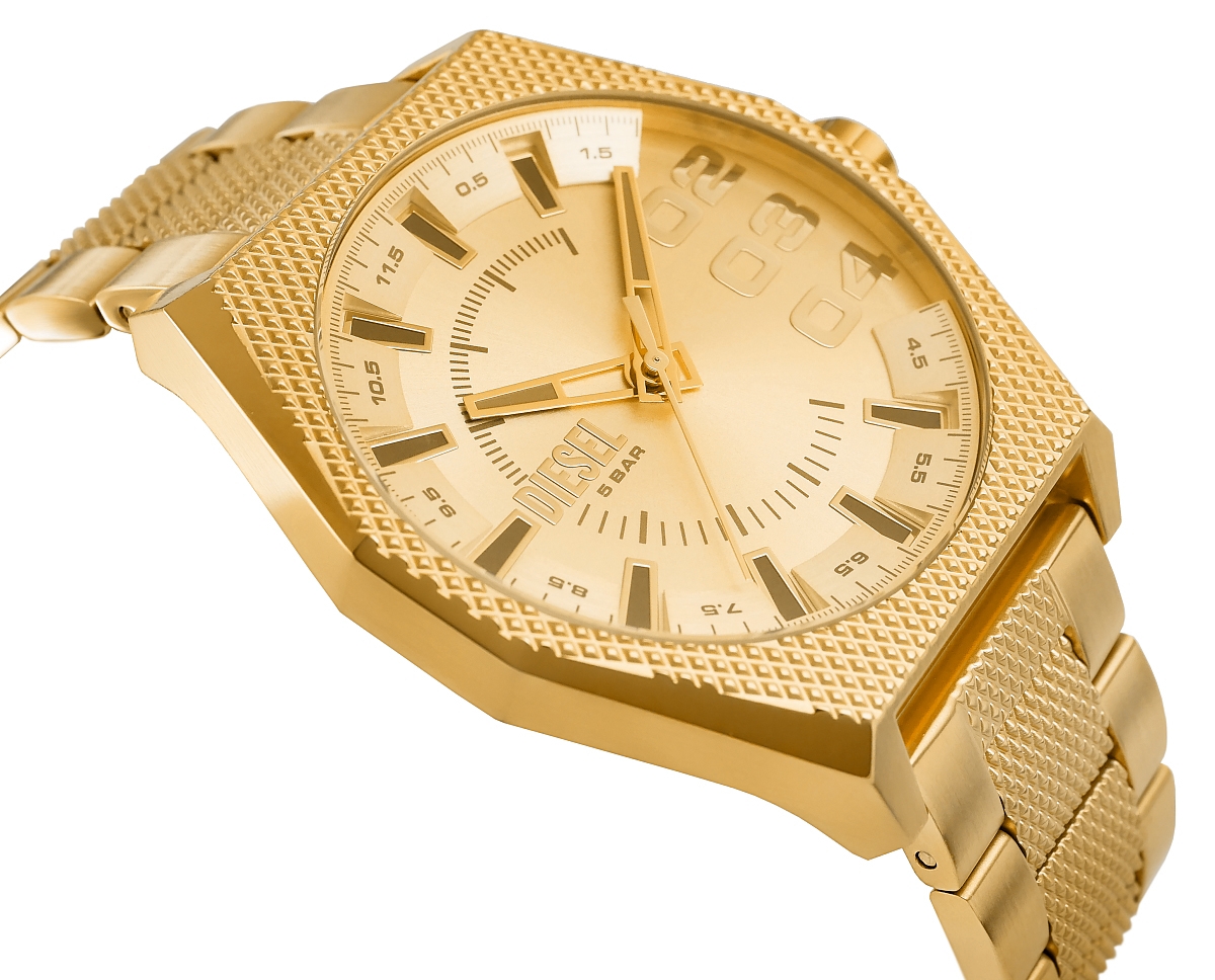 Diesel Scarper DZ2173 to zegarek, który przyciąga wzrok i budzi respekt. Jego złota, heksagonalna koperta i masywna bransoleta emanują dominacją, tworząc dodatek, który mówi więcej niż tysiąc słów. Każdy detal – od grawerowanej faktury po trójwymiarowe cyfry na tarczy – podkreśla jego surową, ale luksusową estetykę.