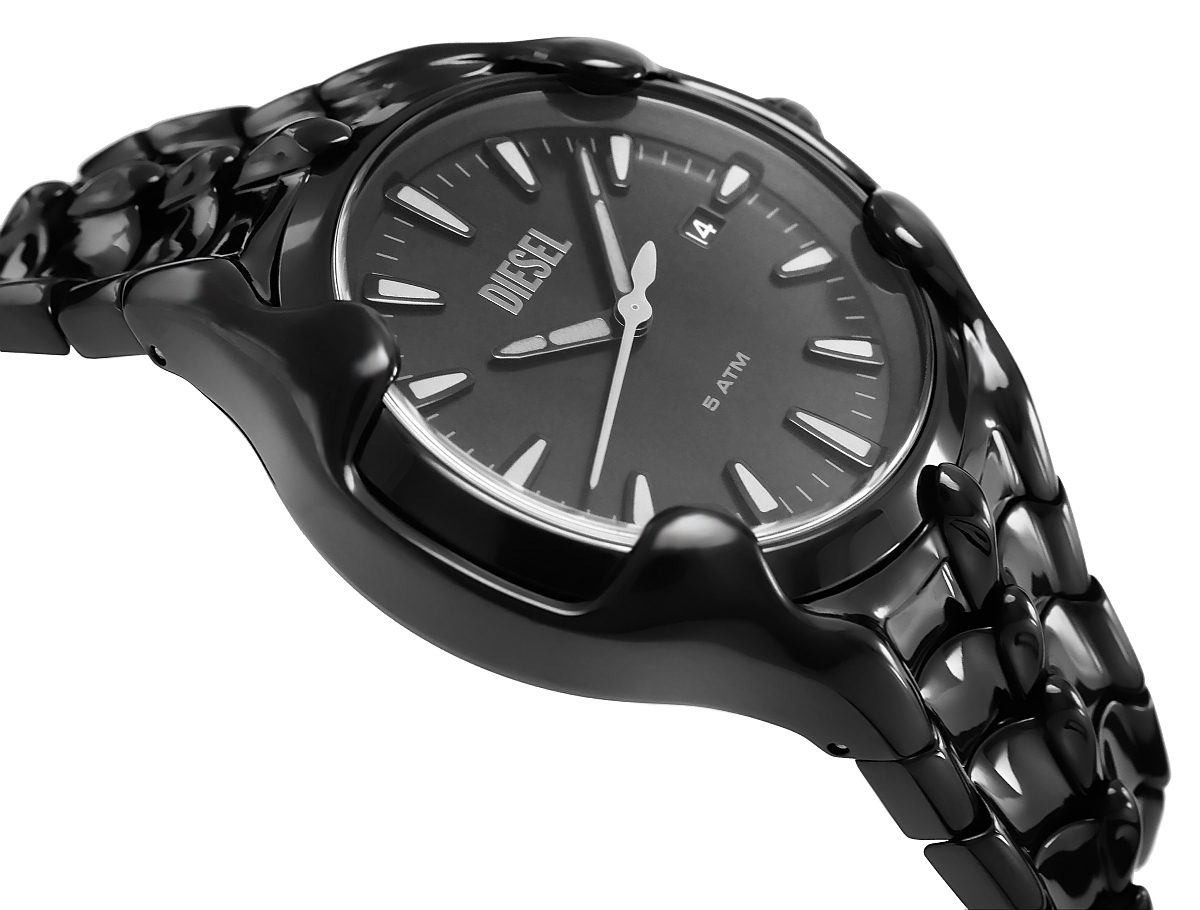Czarna, matowa tarcza to minimalistyczne tło, które wydaje się pochłaniać światło, tworząc przestrzeń idealną do wyeksponowania detali. Każde spojrzenie na nią przypomina o mocy ciemności, a jednocześnie nie ma tu miejsca na zbędny błysk. Tarcza jest spokojna, skupiona – jak Ty w momencie podejmowania ważnych decyzji. Na tej ciemnej powierzchni wyróżnia się srebrne logo Diesel, jak ukryta siła, gotowa do działania. Ten delikatny błysk przykuwa uwagę i dodaje zegarkowi eleganckiego charakteru. Indeksy oraz wskazówki w odcieniach czerni i szarości wtapiają się w tarczę, tworząc wrażenie jednolitej, głębokiej powierzchni. To nie są barwy, które się wybijają – są tu, aby przypominać, że detale mogą decydować o wygranej. Sekundnik w kolorze szarym, jak cień, delikatnie odmierza czas, bez pośpiechu, ale z nieustępliwością. To minimalistyczny akcent, który wzmacnia poczucie harmonii.