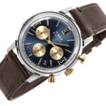 Tarcza zegarka zachwyca głębokim granatowym kolorem z eleganckim wykończeniem sunray, które pięknie odbija światło. Jasne, pełne cyfry arabskie zapewniają czytelność, a złote wskazówki – pokryte fluorescencyjną powłoką – pozwalają łatwo odczytać czas także po zmroku. Sekundnik wyróżnia się smukłą sylwetką i finezyjnym grotem w kształcie strzałki, który dodaje całemu projektowi lekkości i dynamiki.