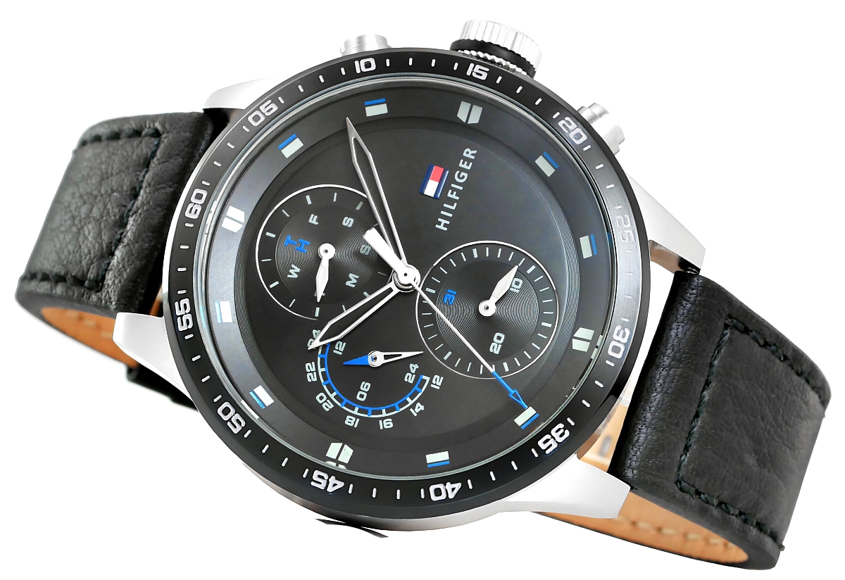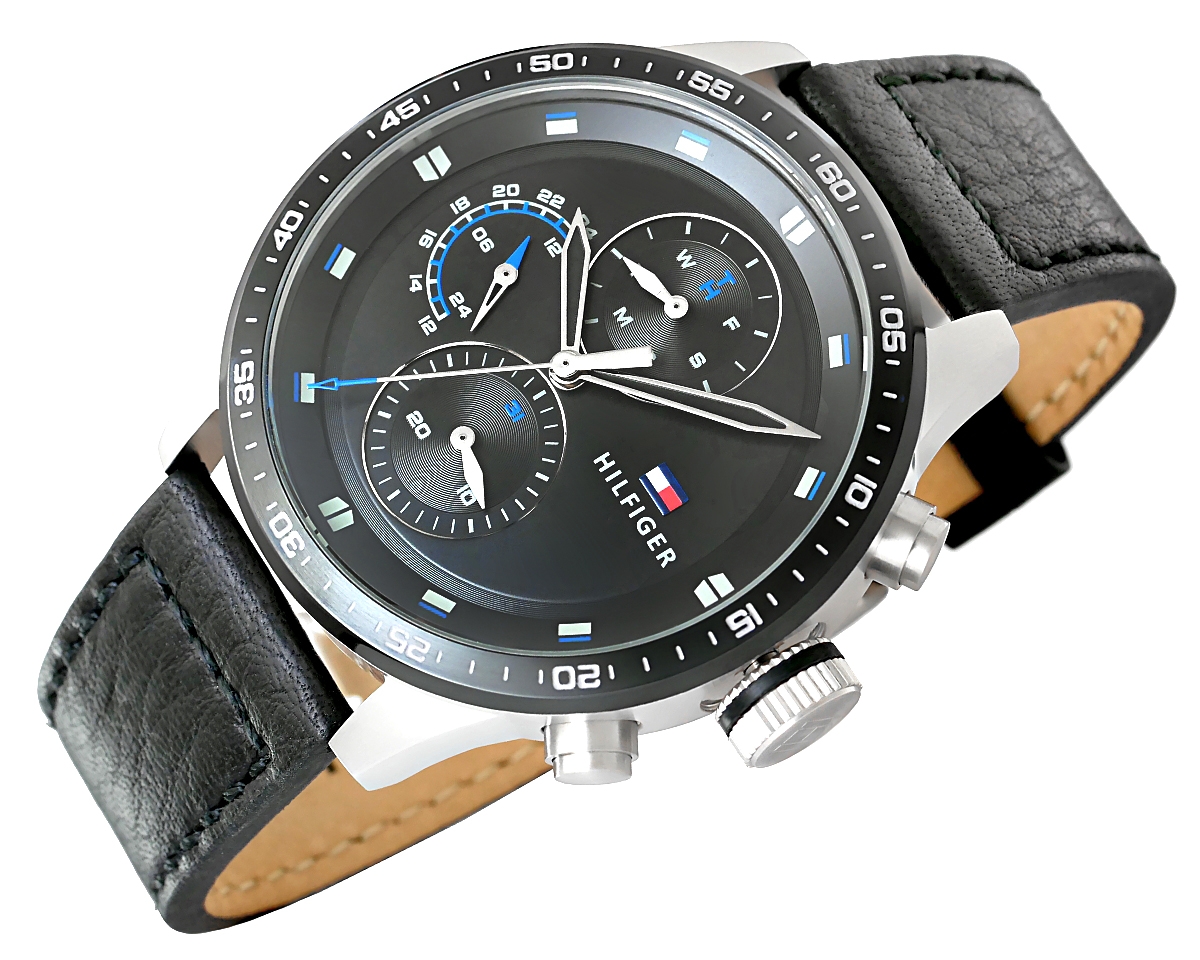 Zegarek męski Tommy Hilfiger 1791810 wyposażony jest w działające chronografy: czasu dobowego 12/24h- wyświetlanie godziny z uwzględnieniem całej doby umożliwia rozróżnienie godzin przed i popołudniowych oraz datownika dni tygodnia i miesiąca.