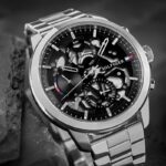 Model posiada tarczę typu „open heart”, która pozwala zajrzeć do wnętrza zegarka. Ta stylowa konstrukcja odsłania fragmenty pracy serca zegarka, dodając mu dynamicznego i nowoczesnego charakteru. Open heart w tym modelu nie tylko zachwyca wizualnie, ale również podkreśla kunszt zegarmistrzowski, czyniąc każdy rzut oka na tarczę wyjątkowym doświadczeniem. Granatowa tarcza ze szlifem słonecznym oraz giloszowanymi detalami wprowadza głębię i elegancję, a odsłonięcie części mechanizmu w centralnym punkcie nadaje całości technicznej finezji. Luksusowy akcent w postaci skórzanego paska w stylu krokodyla emanuje wyrafinowaniem, doskonale współgrając z srebrną kopertą.