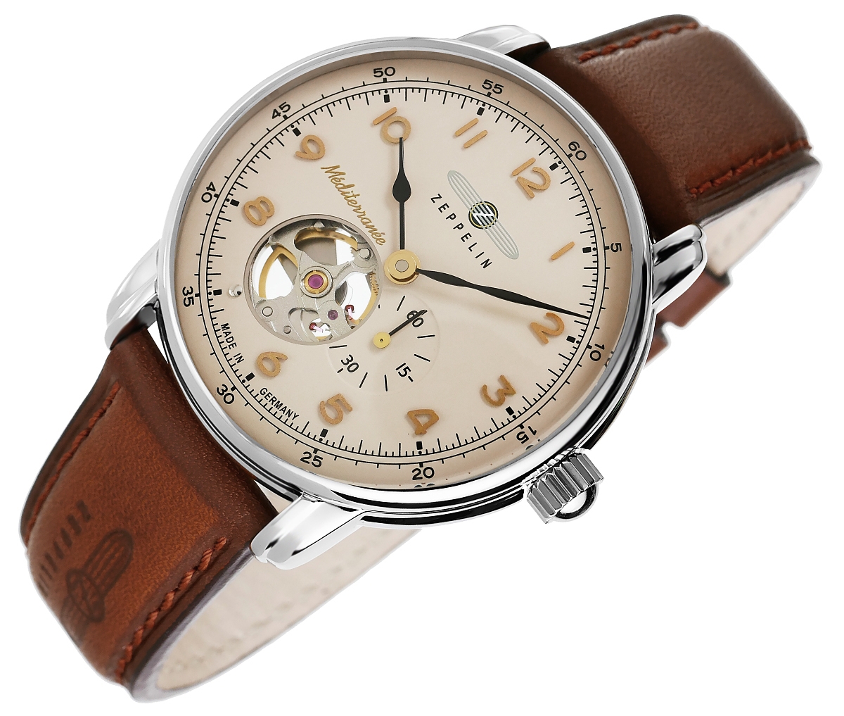 Model, który swoją nazwę zawdzięcza inspiracji śródziemnomorskim klimatem oraz wyjątkowemu detalowi w postaci widocznego „otwartego serca” mechanizmu na tarczy. Słowo „Mediterranee” odnosi się do elegancji i ciepła regionu Morza Śródziemnego, co znajduje odzwierciedlenie w jego subtelnej kolorystyce i klasycznym wzornictwie. Beżowa tarcza z delikatnym połyskiem przywodzi na myśl słoneczne wybrzeża, a brązowy, skórzany pasek z tłoczonym logo Zeppelin podkreśla charakter vintage. Beżowa tarcza z arabskimi cyframi i precyzyjnymi indeksami minutowymi zapewnia doskonałą czytelność.
